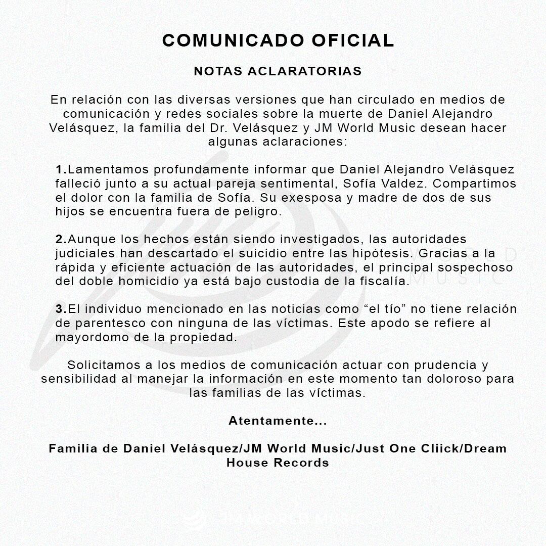 A través de un comunicado, la familia del productor dice que quien al parecer habría asesinado a Daniel Alejandro y su pareja sentimental ya está vinculado a la investigación por la Fiscalía.