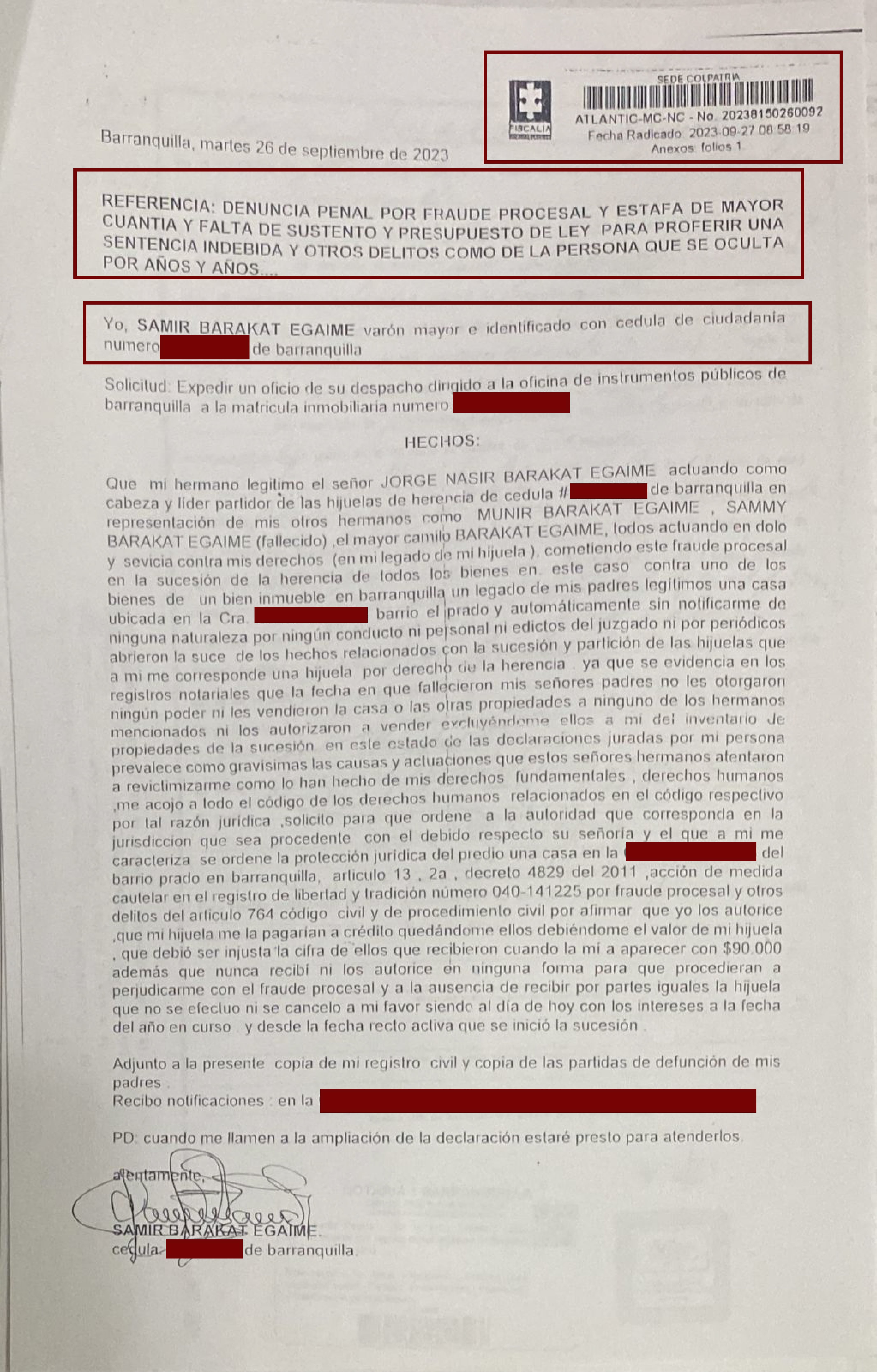 En los registros judiciales figura que el señor Samir dice que, su hermano Jorge Nasir Barakat, antes de morir, le confesó que, presuntamente, sus otros tres hermanos le habrían ocultado el proceso de sucesión de una millonaria herencia y supuestamente le habrían falsificado la firma.