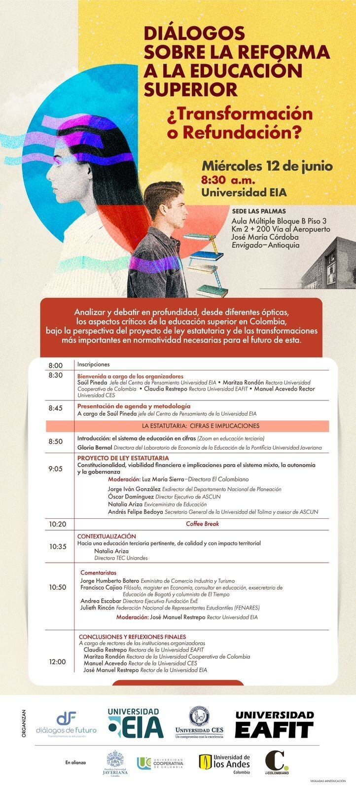 Finalmente, dicho encuentro, que es apoyado por la universidad EAFIT, el CES, la organización Diálogos de Futuro y las universidades Javeriana, Andes y Cooperativa de Colombia, tiene como objetivo incidir, a través del diálogo y el debate de ideas, en las deliberaciones sobre el futuro de la educación superior en Colombia.