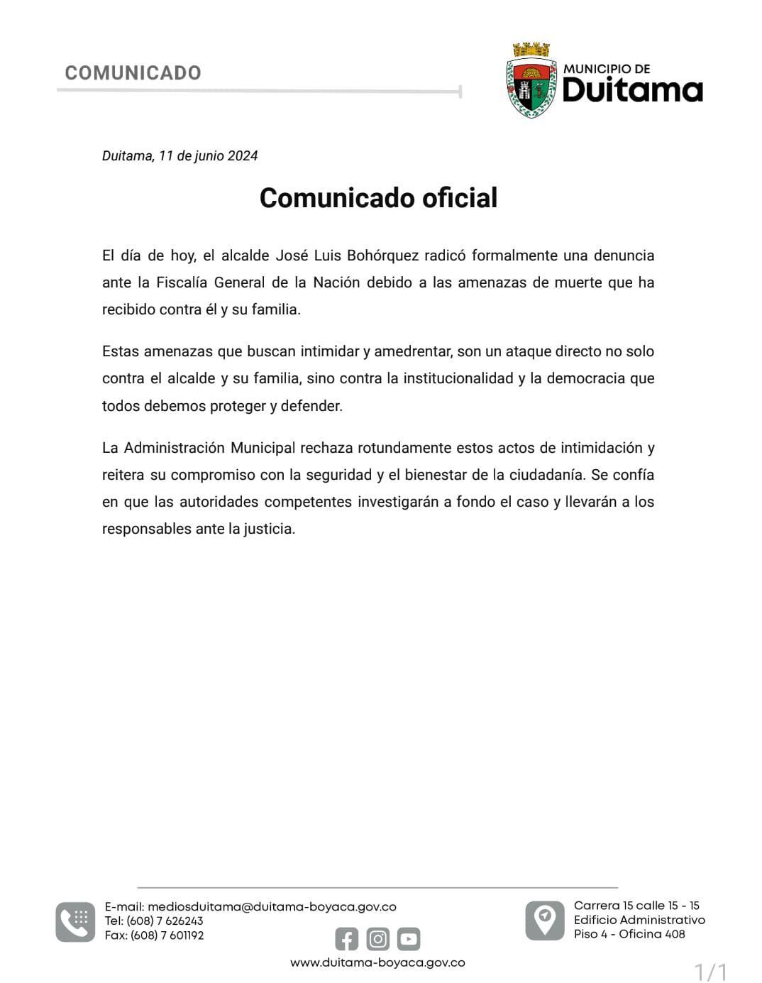 Por último, el alcalde Bohórquez hizo un llamado a la calma y la solidaridad entre los habitantes de Duitama. “Es fundamental que permanezcamos unidos frente a estos actos de intimidación”, expresó. “Juntos, como comunidad, podremos superar este desafío y continuar trabajando por el bienestar de todos los ciudadanos”.