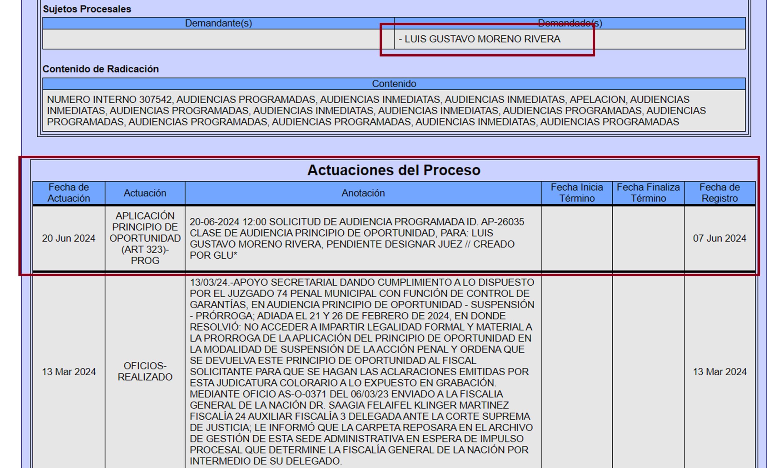 Caracol Radio supo que la Fiscalía renovó por un año más el principio de oportunidad al abogado Luis Gustavo Moreno, y sigue siendo el testigo “estrella” del caso ‘Cartel de la Toga’. La audiencia de control de legalidad se programó para el próximo 20 de junio, a las 12 m, ante el juzgado 74 de control de Garantías de Bogotá.