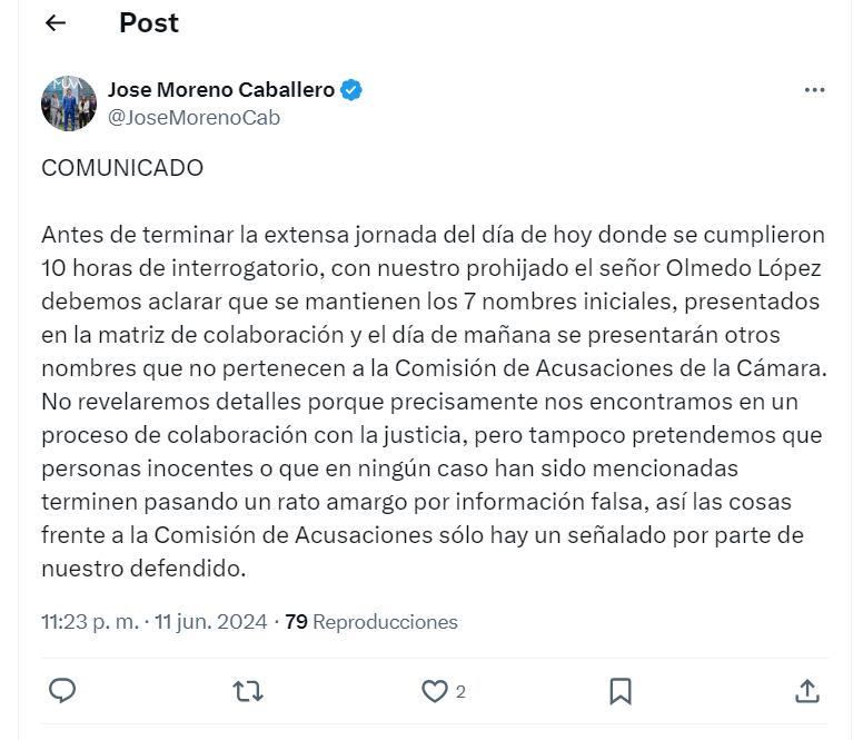 Por su parte, el abogado José Luis Moreno, quien representa a Olmedo López, también dijo en su cuenta de “X” que ayer, fueron 10 horas de interrogatorio, por ahora hay siete nombres y hoy ampliará la matriz de colaboración.