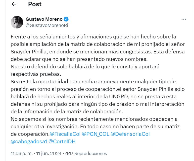 “Esta defensa debe aclarar que no se han presentado nuevos nombres. Nuestro defendido solo hablará de lo que le consta y aportará respectivas pruebas. (…) No sabemos si los nombres recientemente mencionados obedecen a cualquier otra investigación. En todo caso no hacen parte de su matriz de cooperación”.