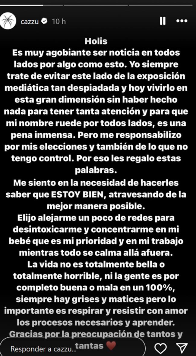 “Me siento en la necesidad de hacerles saber que estoy bien, atravesando de la mejor manera posible. Elijo alejarme de las redes para desintoxicarme y concentrarme en mi bebé que es mi prioridad y en mi trabajo mientras todo se calma allá afuera”, agregó Cazzu.