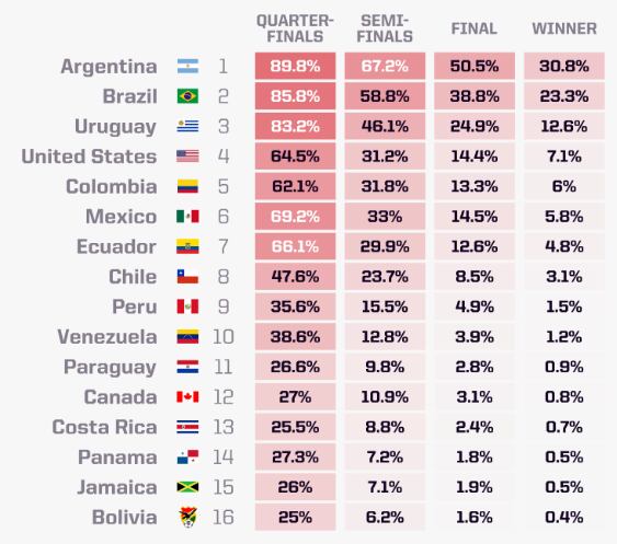 Argentina parte como la gran favorita de la Copa, al tener unas probabilidades 50.5 & de ser finalista y del 30.8% de ser campeona, mientras que Brasil, segunda en el listado, tiene un 38.8% de chances de meterse a la final y un 23.3% de conquistar el torneo. En un segundo orden aparecen Uruguay y Estados Unidos, con un 12.6% y 7.1%, respectivamente, de quedarse con el título.