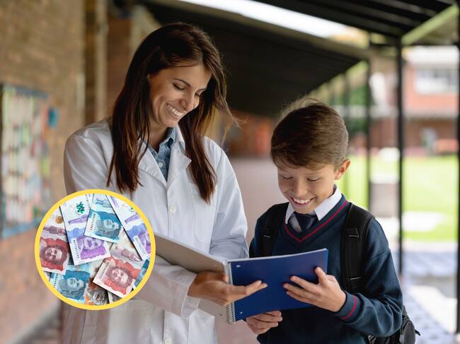 Docente hablando con su estudiante. En el círculo, imagen de billetes colombianos (GettyImages)