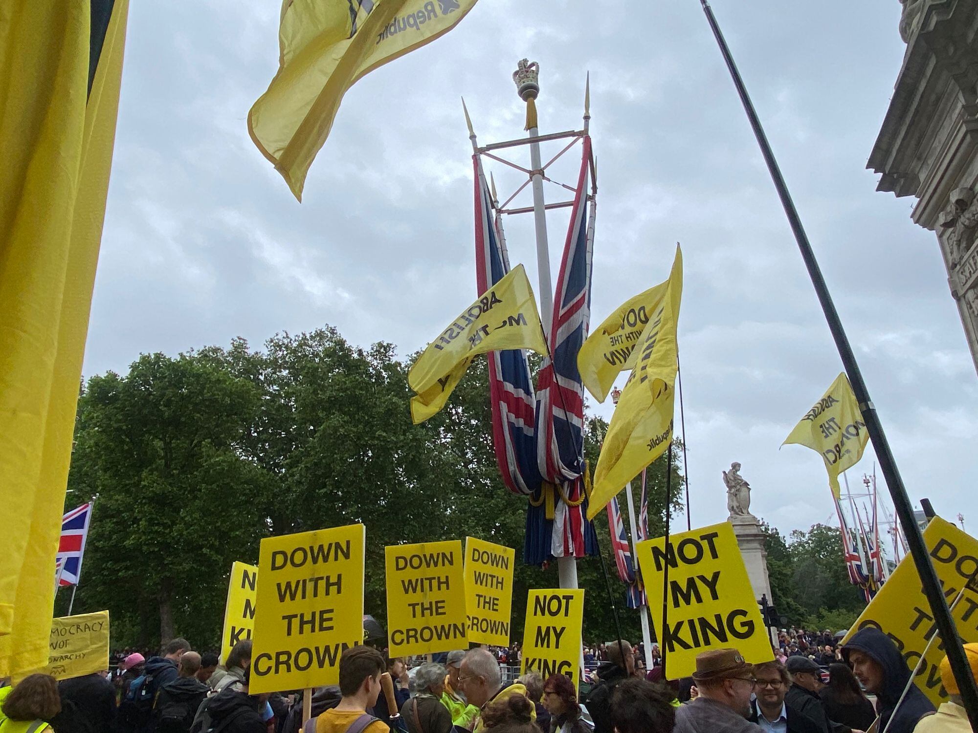 Entre los seguidores de la corona se mezclaron manifestantes antimonárquicos, que llevaban pequeñas banderas amarillas con el lema “Not my king” (No mi rey). Catalina había anunciado el 22 de marzo en un vídeo que le habían diagnosticado un cáncer, del que no dio detalles, y que había comenzado sesiones de quimioterapia.
