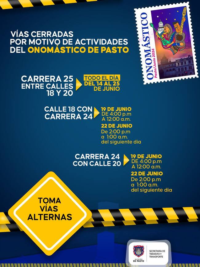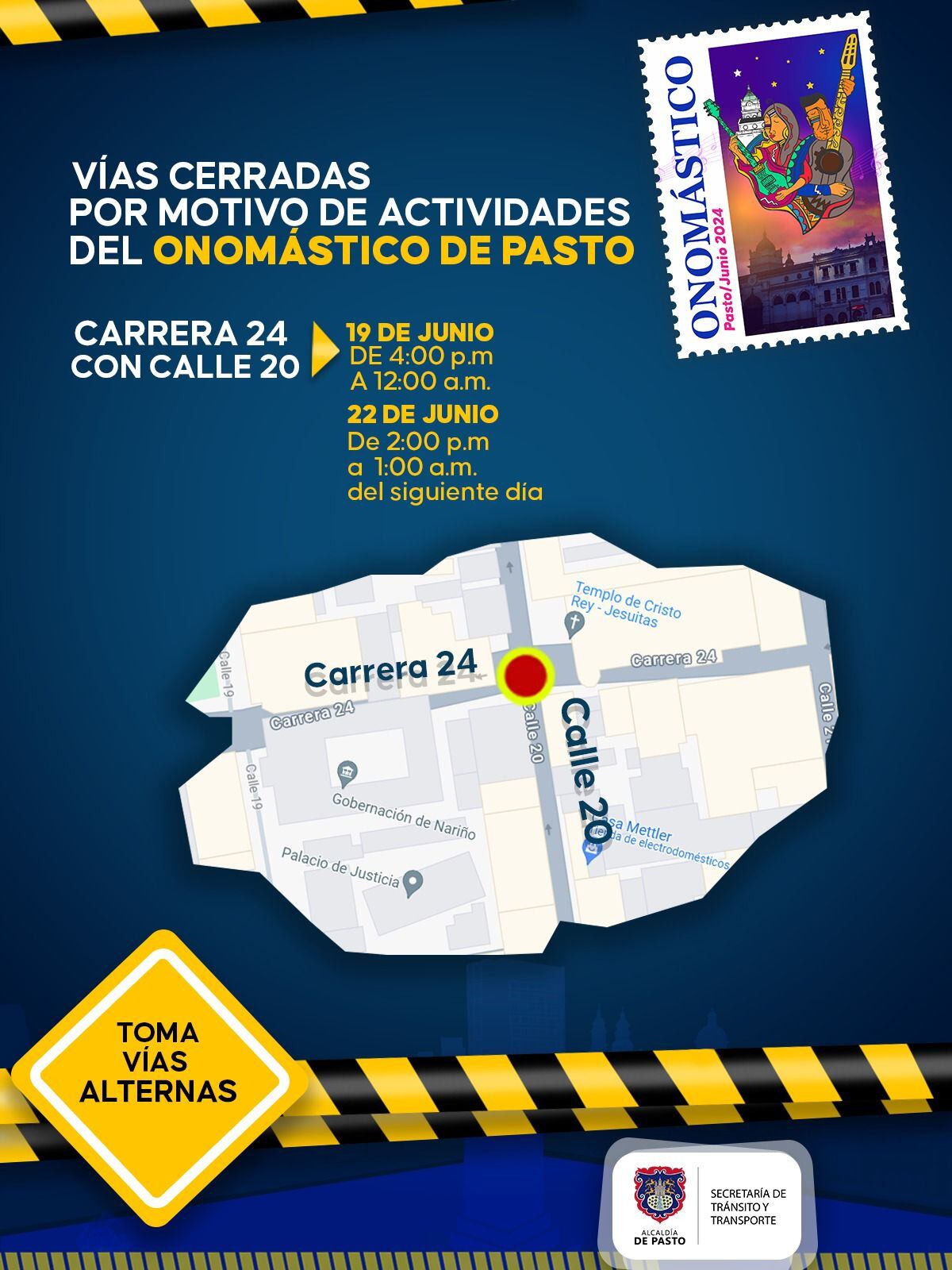 La Secretaría de Tránsito y Transporte, a través de la Resolución 1775 del 14 de junio del 2024, estableció el cierre de diferentes vías del centro de Pasto por cuenta del Onomástico 2024. Ante ello se ordenó un plan de cierre y de desvíos en puntos estratégicos del Centro Histórico de la capital nariñense.