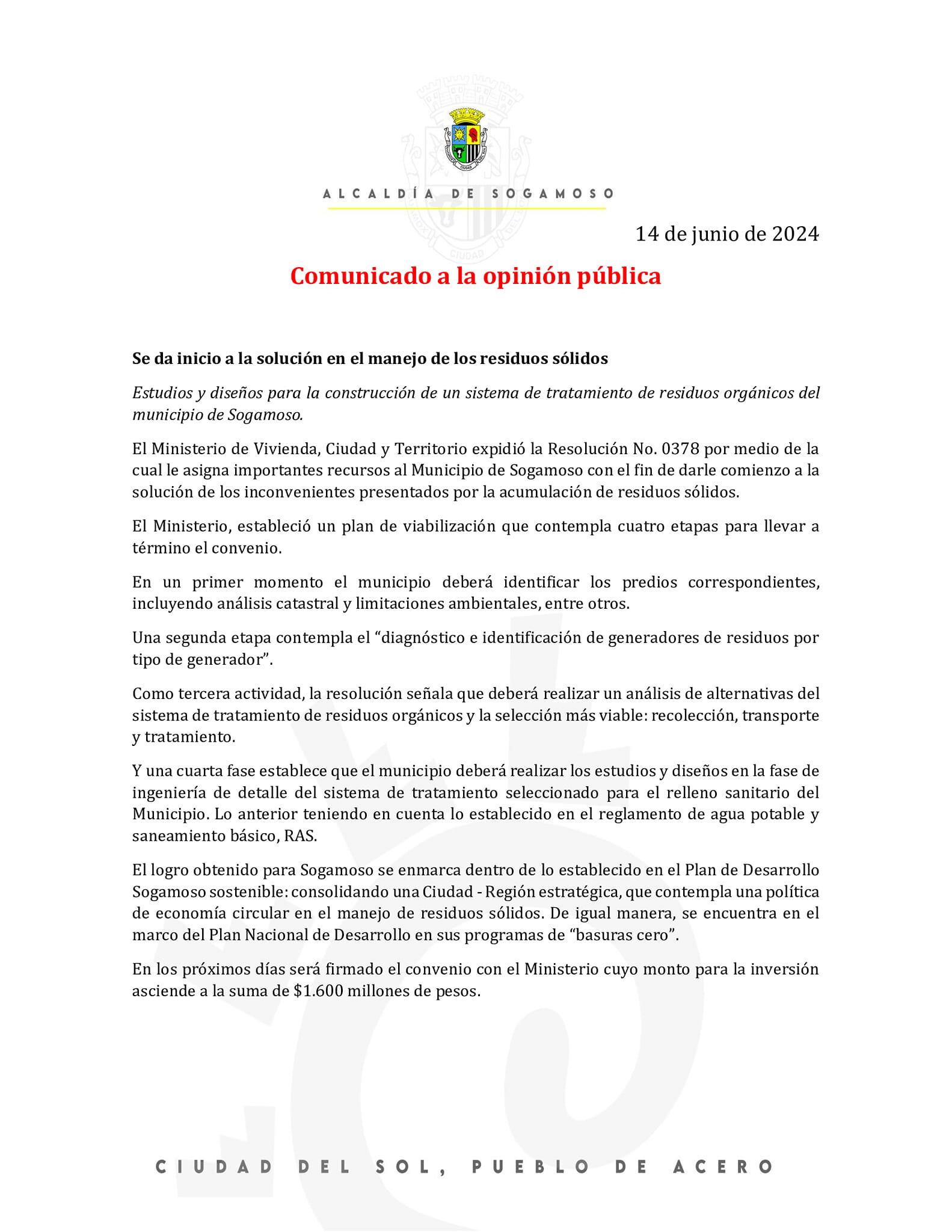 En el comunicado emitido por la Alcaldía de Sogamoso (Boyacá), se señalan las fases para los estudios y diseños para la construcción de esta planta de tratamiento de residuos orgánicos.