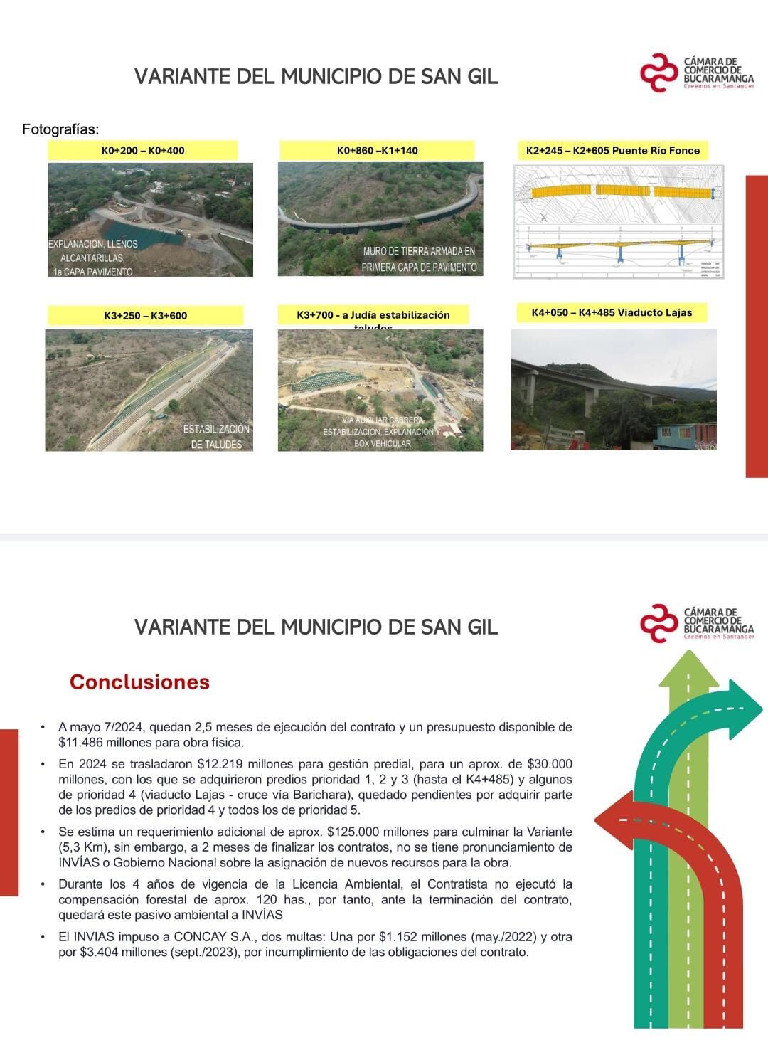 “La compra de predios se ejecutó para los 4.3 kilómetros. Hubo unos recursos adicionales que se invirtieron en la adquisición de predios en la conexión con la vía a Barichara. Se adquirieron por avalúos que iban a vencer, generando efectos de daño fiscal”, explicó.