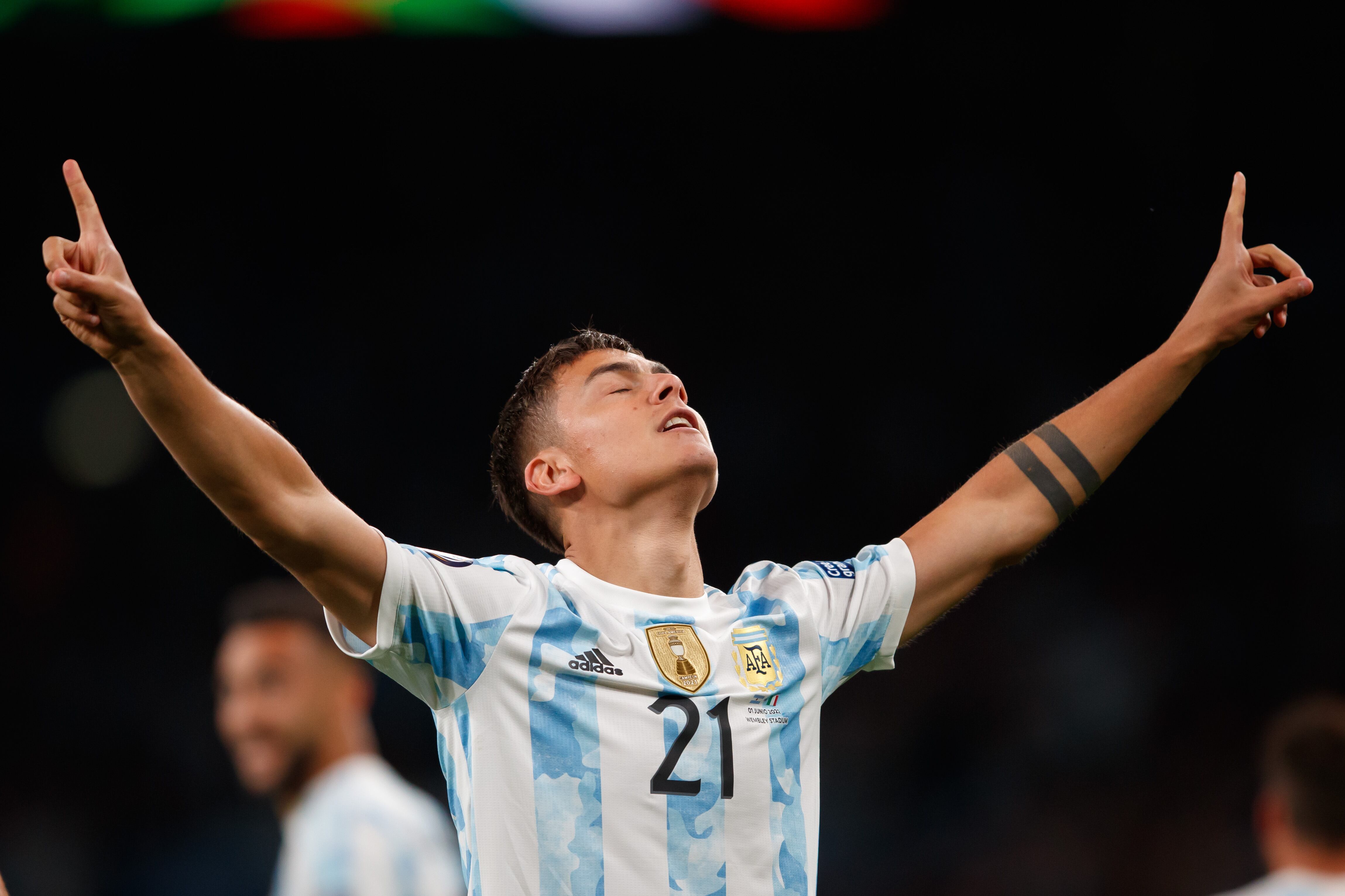 El jugador argentino, Paulo Dybala, celebra un gol durante la Finalissima 2022, el 1 de junio de 2022 en Londres, Inglaterra. (Photo by Marc Atkins/Getty Images) / Marc Atkins
