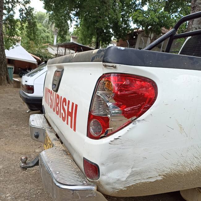 La camioneta de placas públicas ODR 271, Mitsubishi, doble cabina, 4x4, modelo 2015, sufrió importantes daños, como la pérdida del stop derecho, daños en latas en el costado derecho y la ruptura del parabrisas.