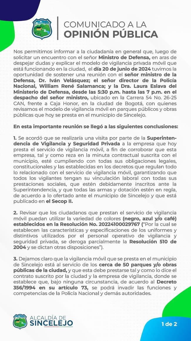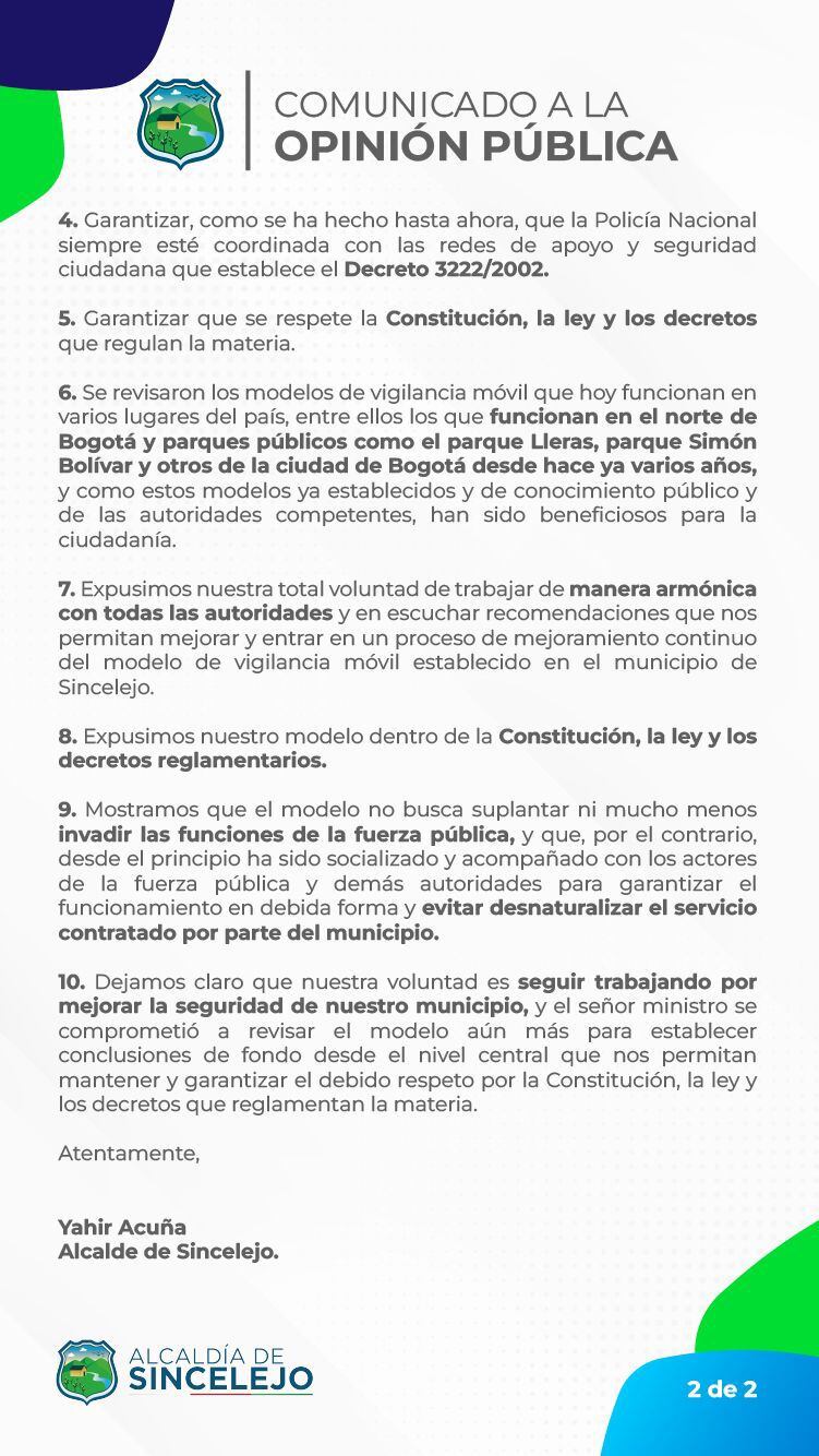 “Aclaramos que la vigilancia móvil que se presta en el municipio de Sincelejo está al servicio de los cerca de 50 parques y/o obras públicas, y que esta debe prestarse tal y como lo dice el contrato suscrito […] donde se establece que, bajo ninguna circunstancia, se podrán invadir las funciones y competencias de la Policía Nacional y demás autoridades”, afirmó el alcalde.