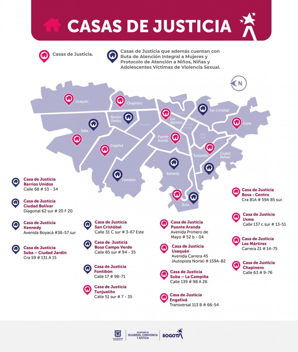 En Bogotá existen 16 casa de justicia que están ubicadas en las principales localidades de la ciudad, en ellas los ciudadanos pueden acceder a servicios de apoyo y denuncia en temas judiciales y de acceso a la justicia. Las tutelas son quizá uno de los servicios mas buscados y en las casas de la justicia hay posibilidad de acceder a un abogado.