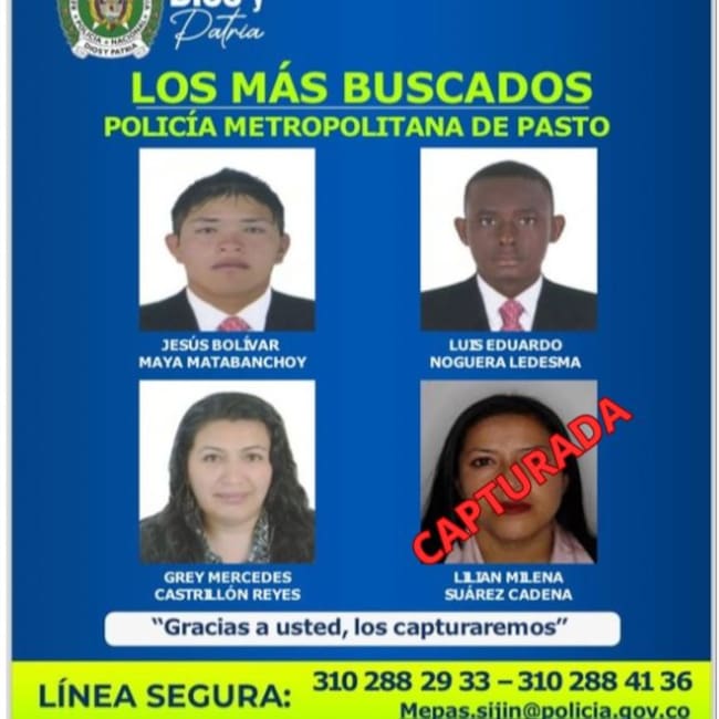 En un operativo de control y verificación de antecedentes, la Policía Metropolitana de Pasto logró la captura de Lilian Milena Suárez Cadena, una de las mujeres más buscadas en Pasto, el operativo tuvo lugar en la vía principal de la calle 9 del barrio Popular, donde agentes del cuadrante 52 identificaron y detuvieron a Suárez Cadena.