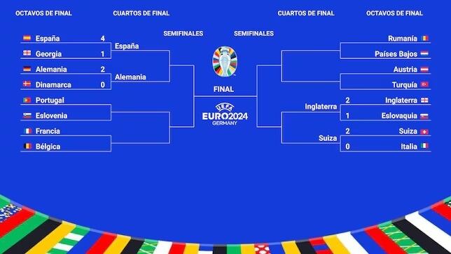 El otro enfrentamiento será entre Suiza, que superó con una alta superioridad a Italia por 2-0, contra el seleccionado de Inglaterra, que estuvo a pocos minutos de quedar fuera del certamen. Sin embargo, Jude Bellingham, de chilena, envió el juego al tiempo extra y en este punto terminaron ganando 2-1, con el otro tanto marcado por Harry Kane.