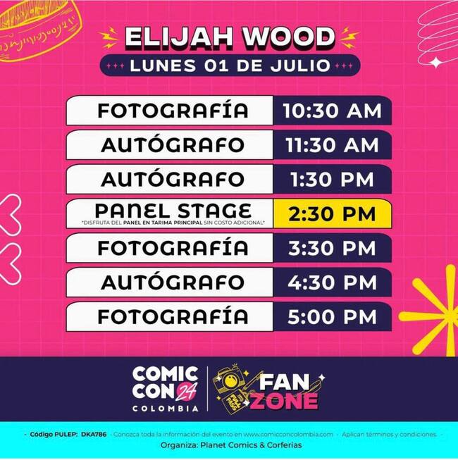 Cronograma de Elijah Wood durante Comic Con Colombia 2024.