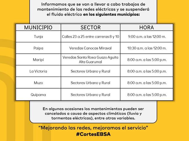 Empresa de Energía de Boyacá realizara cortes de energía en en 6 municipios del departamento