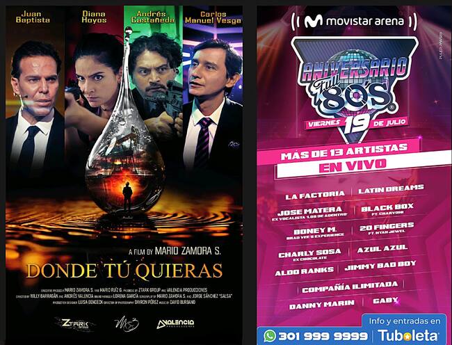 Luego del gran lanzamiento privado de la película, podrás asistir al concierto del ANIVERSARIO FULL 80′S que iniciará a las 8 p.m. el cuál contará con la presencia de los artistas que marcaron la magia de la gran generación de los 80′s La Factoría, Latín Drams, José Matera Exvocalista de los de adentro, Black Box, Boney M, 20 Fingers, Charly Sosa, Azul Azul, Aldo Ranks, Jimmy Bad Boy, Compañía ilimitada, Gaby y la Cuota Merenguera de DANNY Marín! quienes interpretarán su extraordinario repertorio musical, que nos hará cantar, bailar y revivir esta época dorada, transformando el Movistar Arena en la disco más grande de los años 80′s.