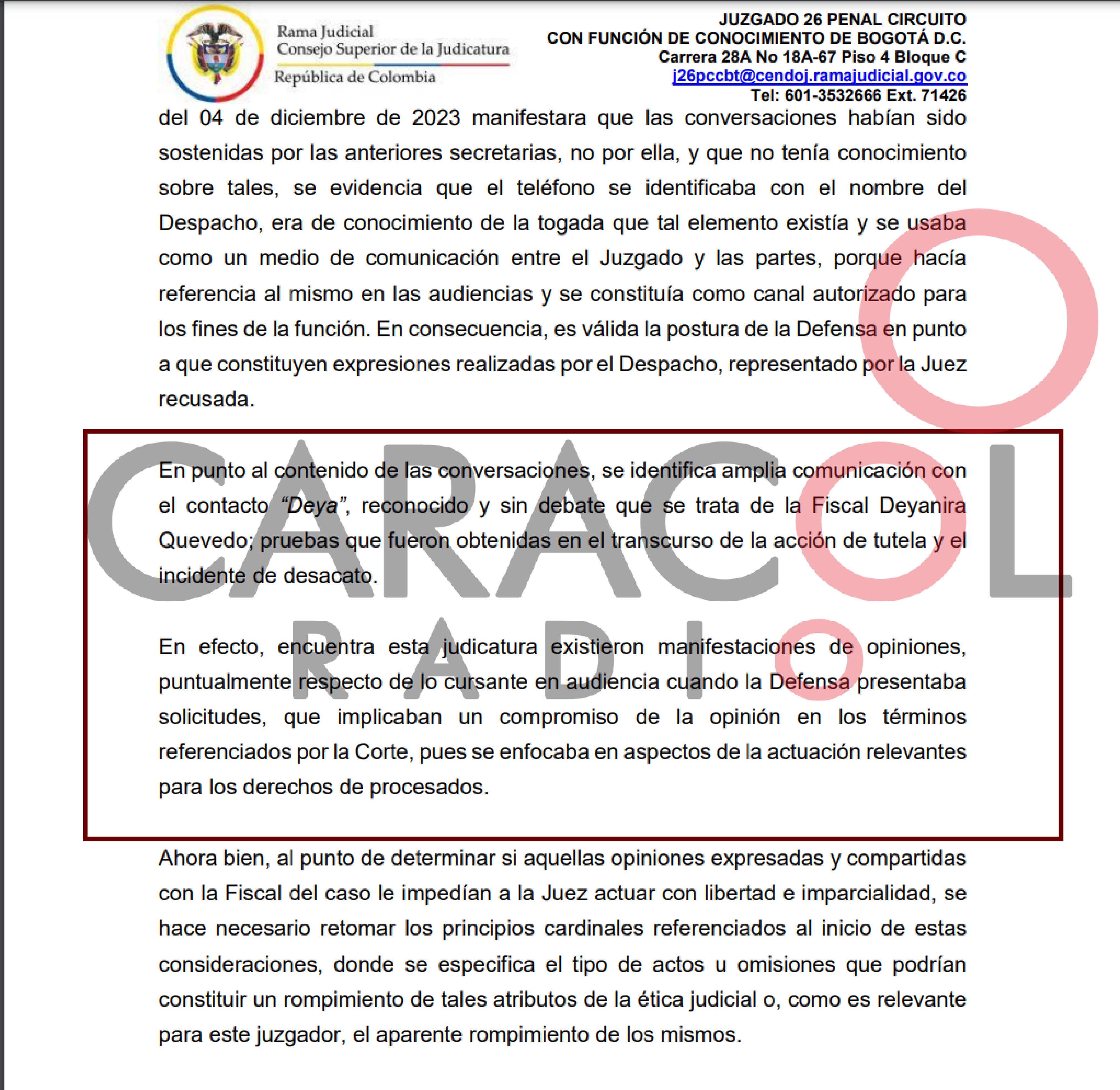 “En punto al contenido de las conversaciones, se identifica amplia comunicación con el contacto “Deya”, reconocido y sin debate que se trata de la Fiscal Deyanira Quevedo; pruebas que fueron obtenidas en el transcurso de la acción de tutela y el incidente de desacato. En efecto, encuentra esta judicatura existieron manifestaciones de opiniones, puntualmente respecto de lo cursante en audiencia cuando la Defensa presentaba solicitudes, que implicaban un compromiso de la opinión en los términos referenciados por la Corte, pues se enfocaba en aspectos de la actuación relevantes para los derechos de procesados”, indica el auto.