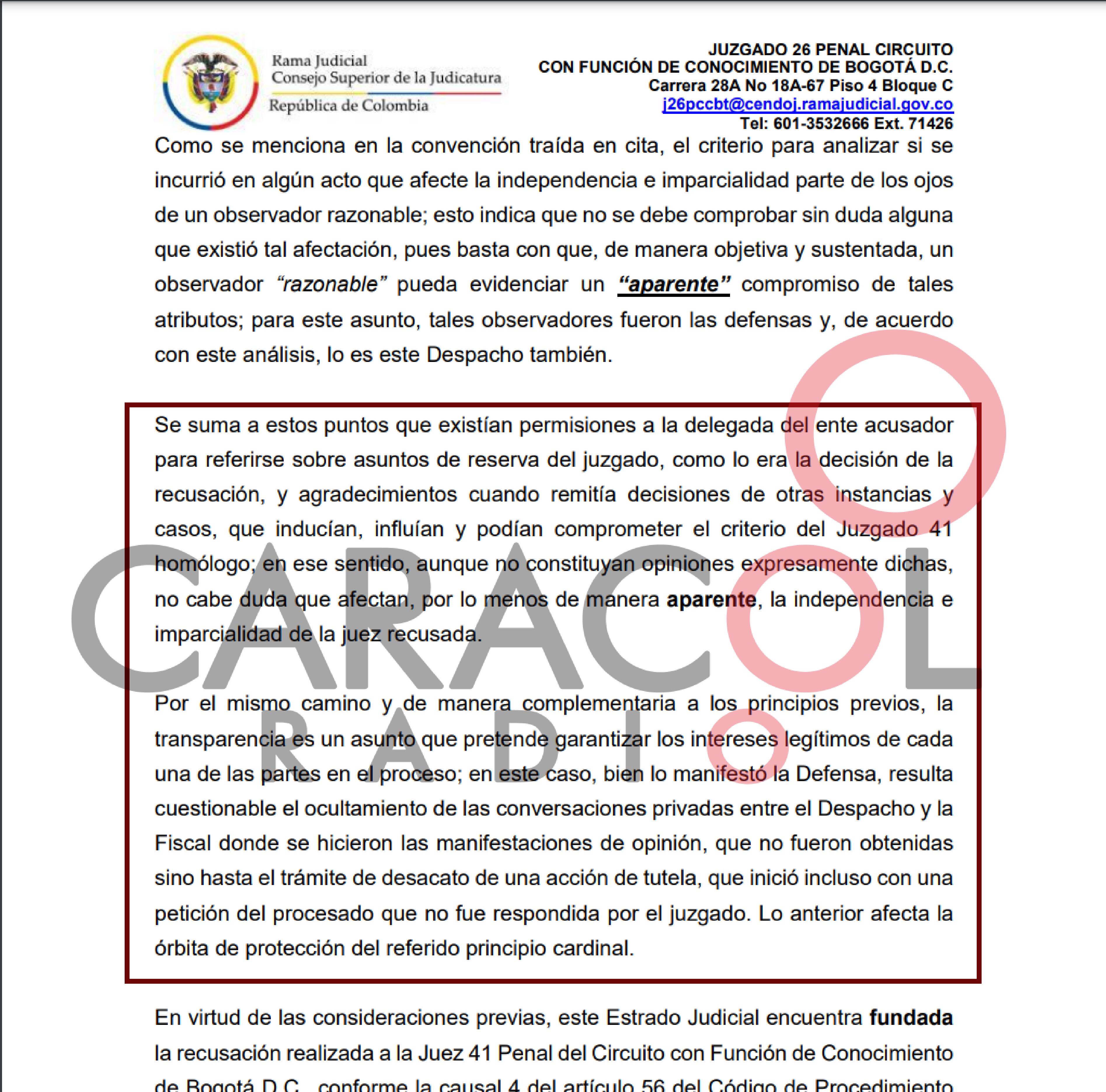 El juez 26 de Conocimiento de Bogotá, le dio la razón a la defensa de los procesados. Al resolver una recusación, determinó que la imparcialidad de la jueza 41 Laura Barrera, y debe apartarse del caso.
