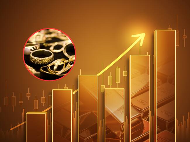 Gráfica de lingotes de oro y cifras fluctuantes hacia la subida y de fondo joyas de oro (Fotos vía Getty Images)