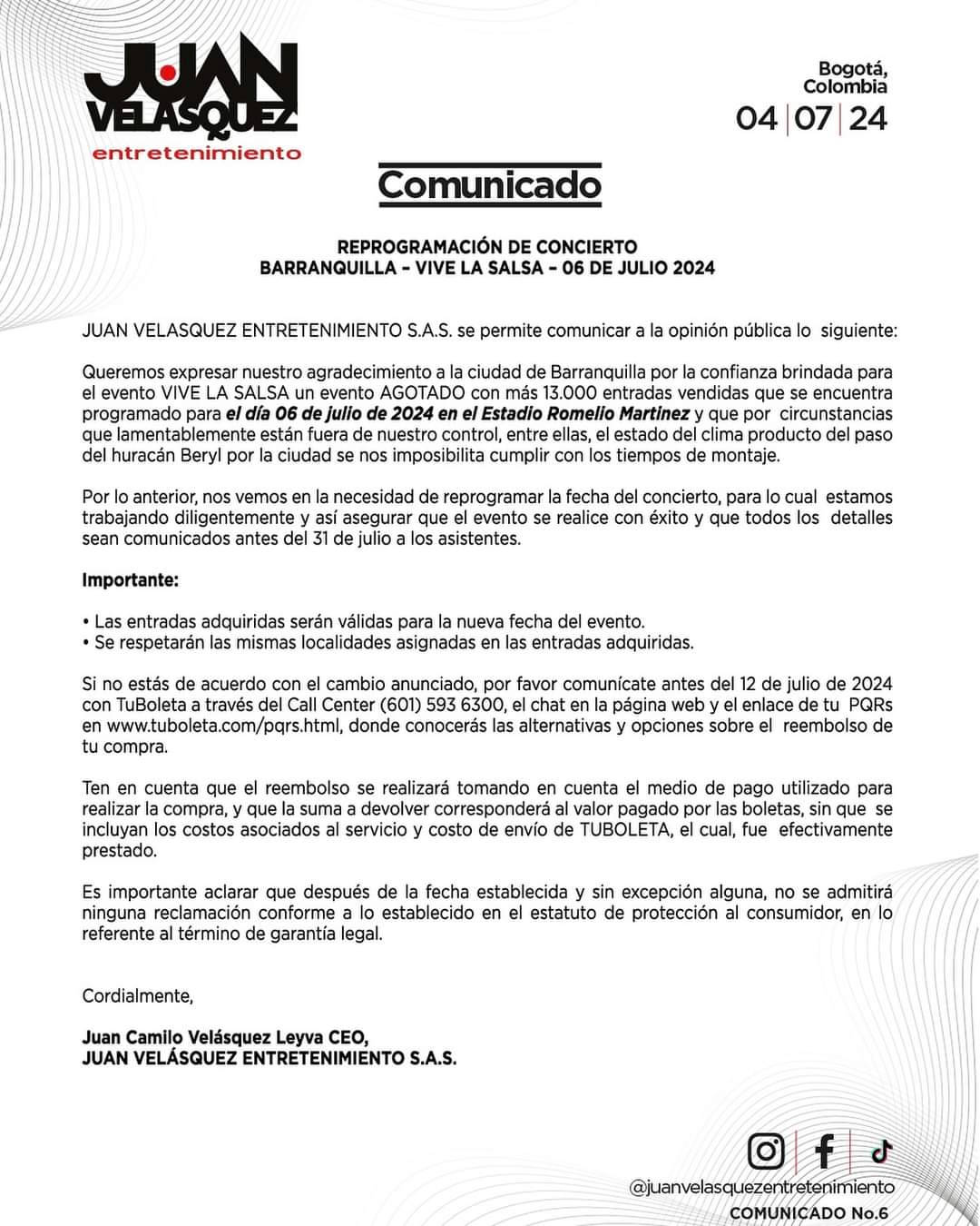 Barranquilla y los salseros del caribe Colombiano quedaron pasmados ante el anuncio de la cancelación del concierto “Vive La Salsa”, el empresario Juan Velázquez emitió un comunicado mostrando las razones por las cuales no pudo cumplir con el tan anhelado y anunciado concierto.