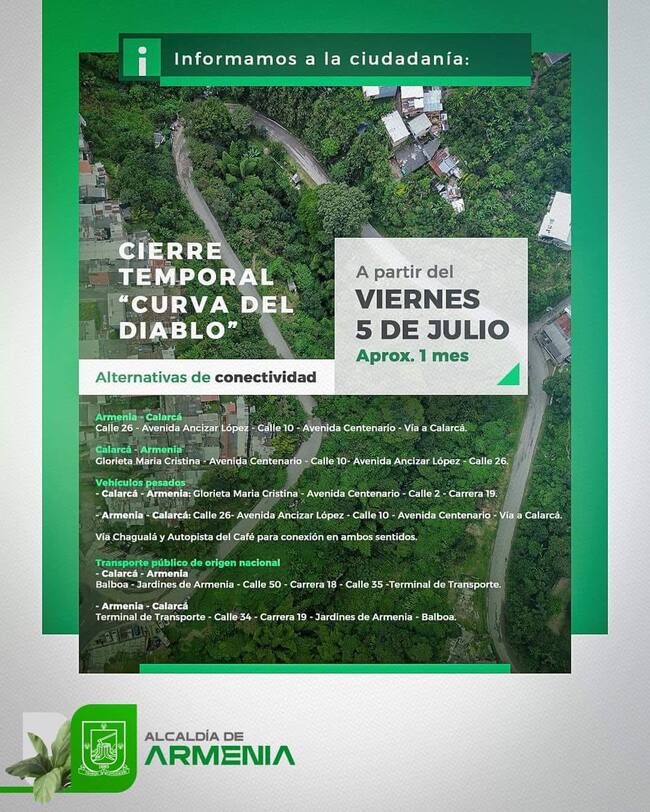 El secretario de tránsito y transporte de Armenia Daniel Jaime Castaño manifestó “con respecto al cierre que se va a tener en el sector de la Curva del Diablo desde el viernes 5 de julio, estará cerrada aproximadamente por un mes, recordemos que es un cierre total de esta zona y se tienen entonces habilitados para vehículos livianos las vías alternas es tomar la calle 10, tantos y si se viene de Calarcá y o vamos de Armenia a Calarcá utilizando la avenida Centenario y la avenida Ancizar López como conexión para vehículos pesados, la vía alterna es a través de la calle Segunda no se habilitó la calle 10 para este tipo de vehículos por los giros que realizan el diámetro pues que deben tener para poder asegurar el tránsito de vehículos pesados, entonces la Calle 10, No nos sirve para esto y por eso se toma la calle Segunda como alterna y la carrera pues ya 19