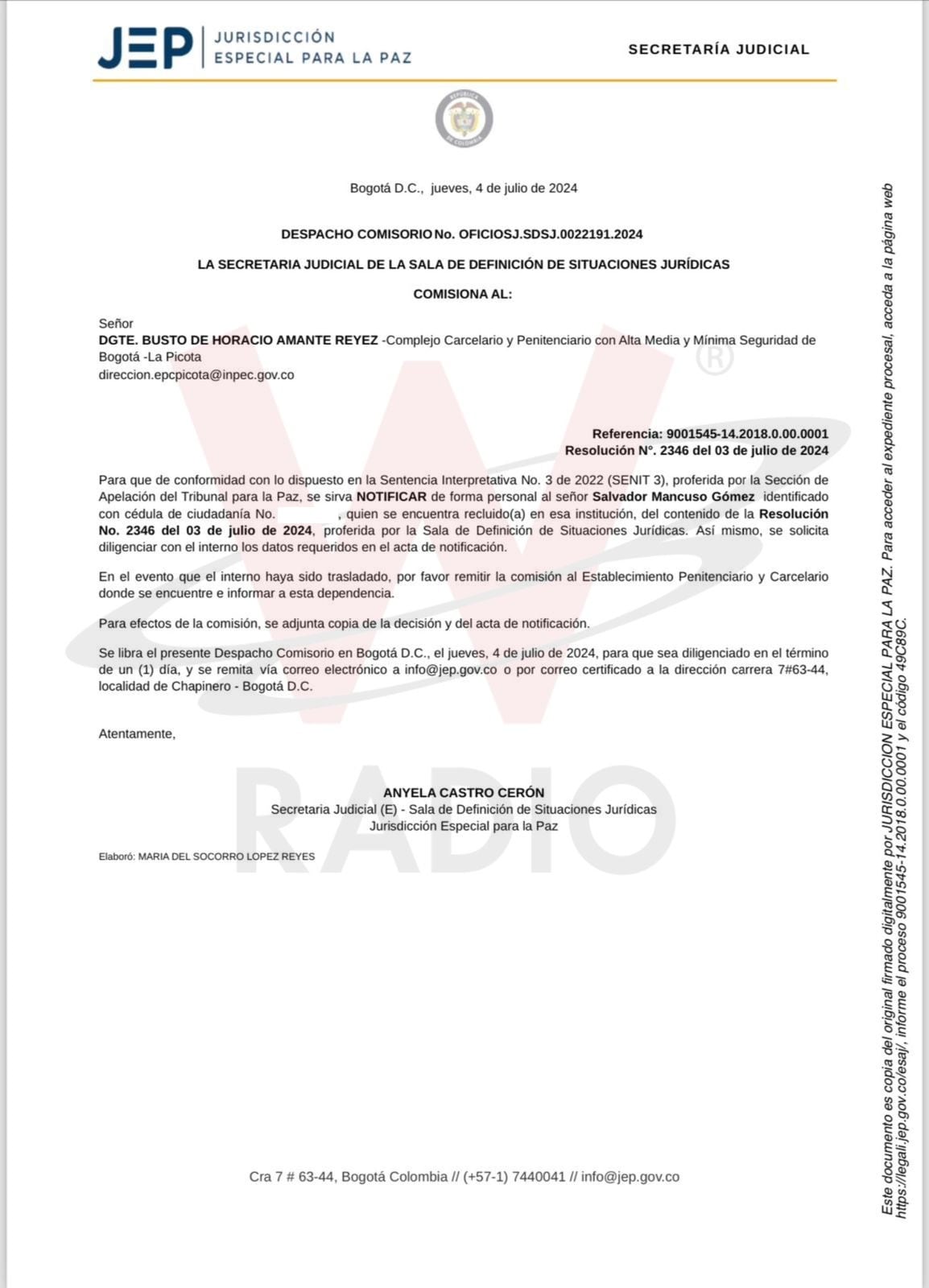 Sin embargo, el dragoneante del INPEC Busto de Amante Horacio Reyes recibió ayer en La Picota la orden de notificarle a Salvatore Mancuso una resolución de la Sala de Definición de Situaciones Jurídicas de la JEP, la Jurisdicción Especial para la Paz, en donde le dicen que no puede dejar la cárcel.