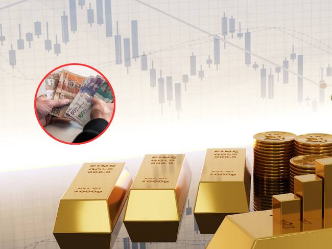 Ilustración de lingotes y piezas de oro con cifras fluctuantes y de fondo una persona con billetes colombianos de diferente denominación (Fotos vía Getty Images).