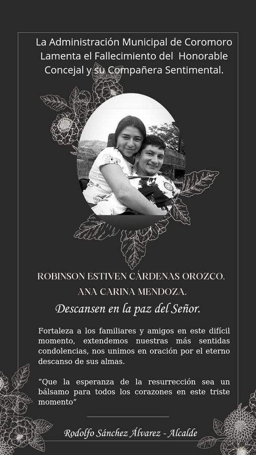 Justamente la alcaldía del municipio de Coromoro lamentó la muerte del concejal Robinson Stiven Cárdenas Orozco de 27 años quien viajaba en la motocicleta junto a su compañera y fueron chocados por el conductor del camión que trató de esquivar un hueco y terminó invadiendo el carril contrario.
