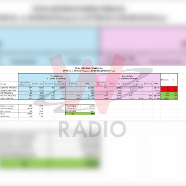 Luego de que el representante a la Cámara Hernán Cadavid, del Centro Democrático, hiciera una denuncia sobre la situación alarmante debido a la salida de uniformados de las Fuerzas Militares y de Policía durante el Gobierno del presidente Gustavo Petro, W Radio consultó las cifras oficiales sobre el retiro de los más de 35.000 uniformados.