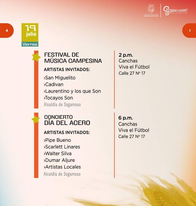 Uno de los puntos más esperados será el Reinado del Sol y del Acero. Además, los visitantes podrán disfrutar de espectáculos pirotécnicos y de presentaciones musicales que incluirán artistas internacionales como Calibre 50 de México y Gusi de Venezuela. Entre los talentos nacionales desataca la agrupación de salsa Fruko, Los Hispanos y Elder Dayán, entre otros artistas.