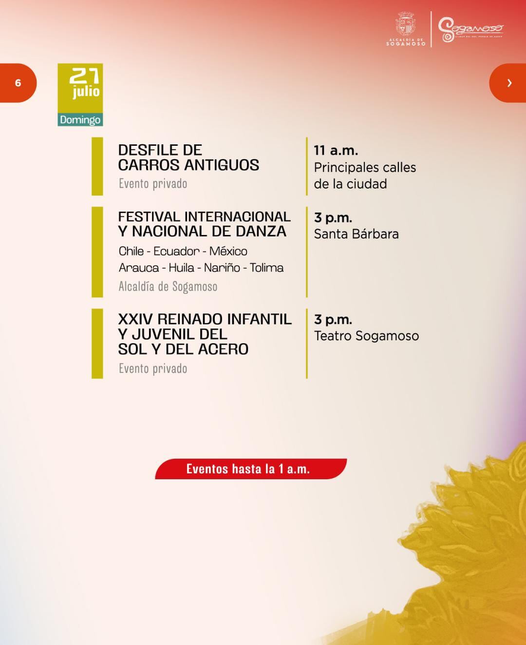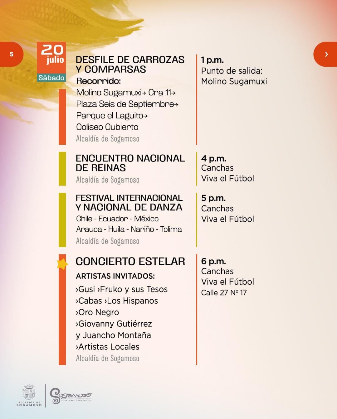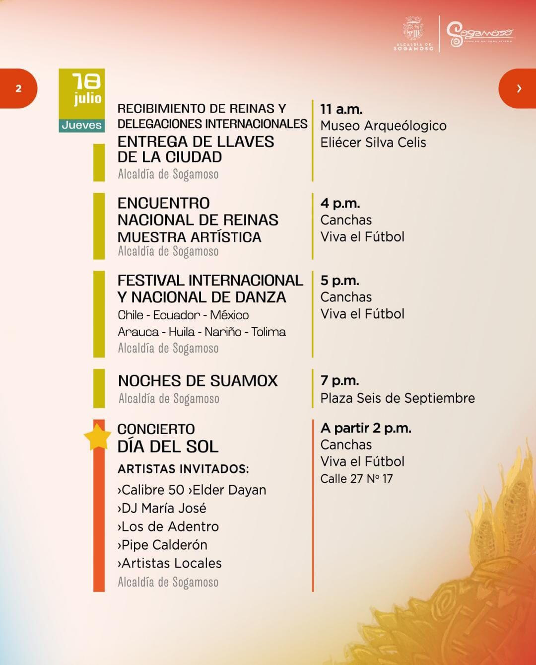 Uno de los puntos más esperados será el Reinado del Sol y del Acero. Además, los visitantes podrán disfrutar de espectáculos pirotécnicos y de presentaciones musicales que incluirán artistas internacionales como Calibre 50 de México y Gusi de Venezuela. Entre los talentos nacionales desataca la agrupación de salsa Fruko, Los Hispanos y Elder Dayán, entre otros artistas.