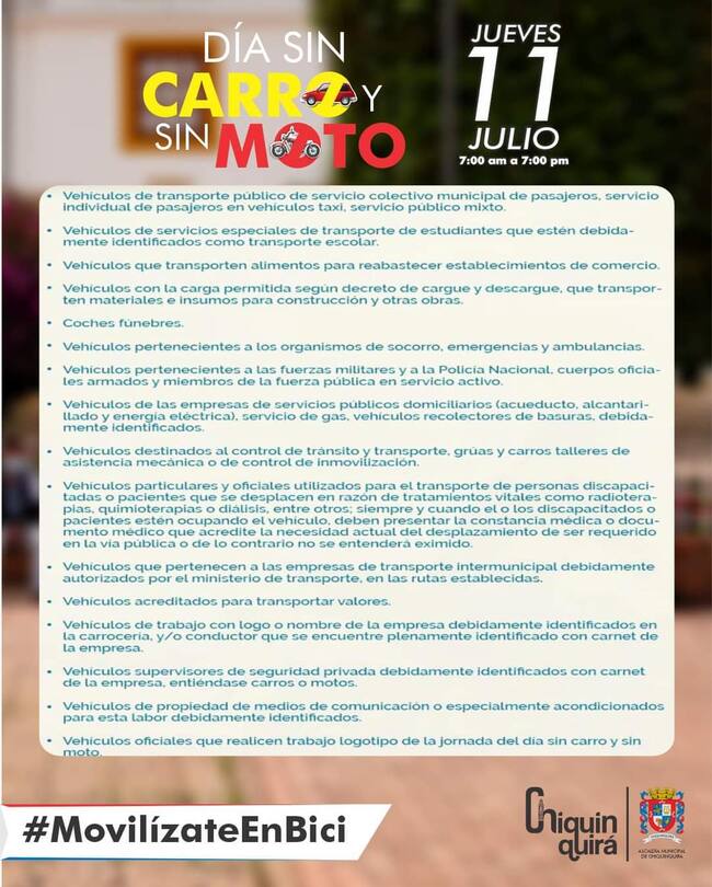 Este jueves 11 de julio no podrán transitar por el municipio de Chiquinquirá, Boyacá, vehículos y motos, debido a la realización de la segunda jornada del Día sin carro y sin moto, la cual irá de 7:00 de la mañana a 7:00 de la noche.