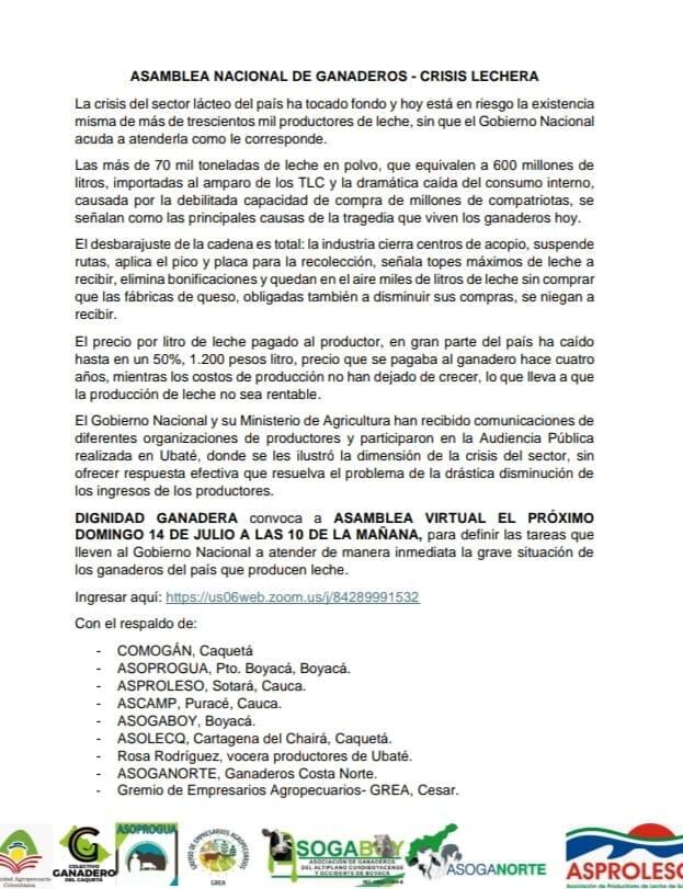 De acuerdo con los productores de leche del país, la crisis del sector lácteo en Colombia ha tocado fondo y hoy está en riesgo la existencia misma de más de 300.000 productores de leche, es por esto que el domingo 14 de julio se llevará a cabo la Asamblea Nacional de Ganaderos, desde las 10:00 de la mañana de manera virtual, donde se definirán las tareas que se lleven al Gobierno nacional para que se atienda de manera inmediata la grave situación de los ganaderos del país que producen leche.