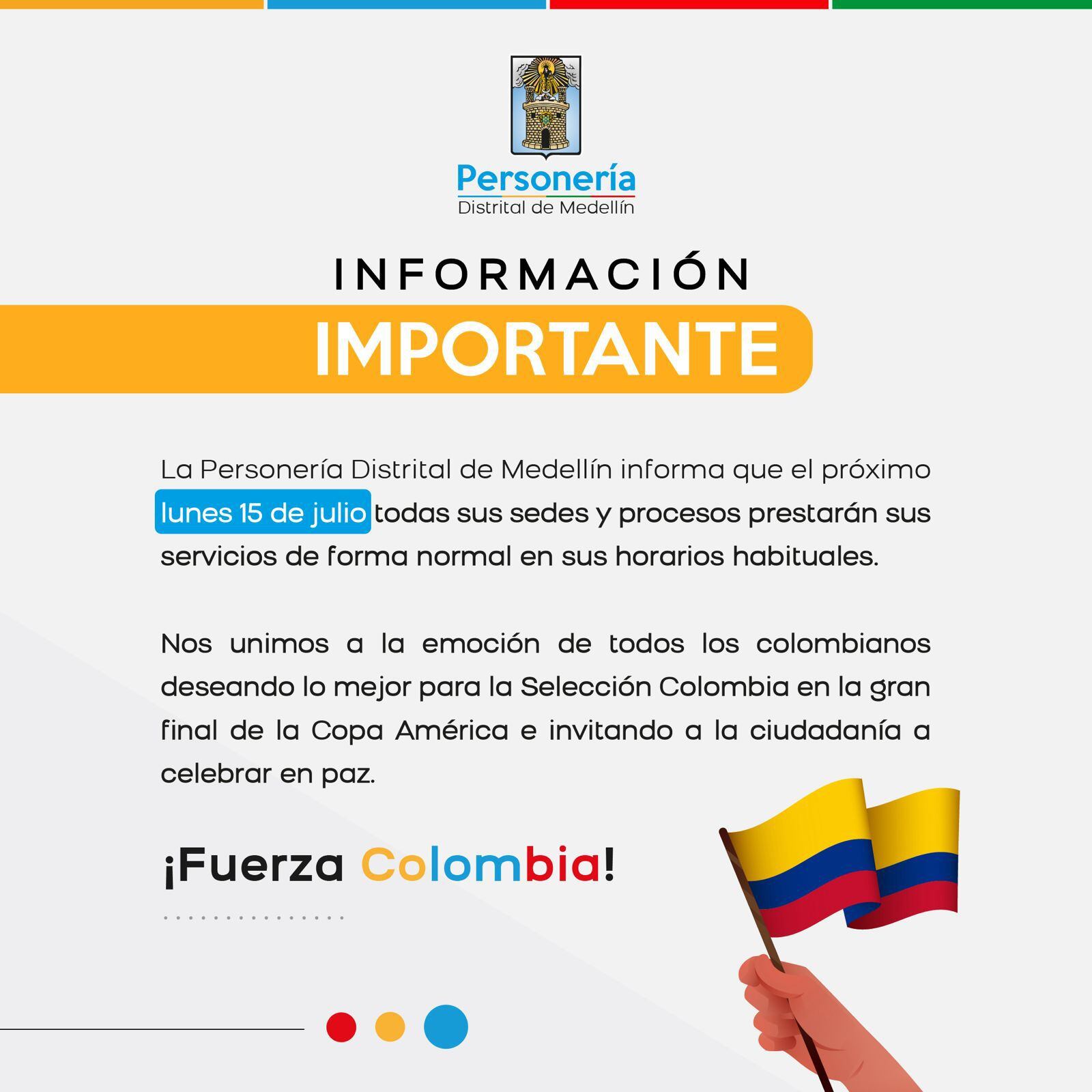 El lunes, las dependencias y entes descentralizados prestarán sus servicios. La Personería de Medellín también confirmó que sus servidores trabajarán y prestarán servicios a la ciudadanía en los horarios acostumbrados.