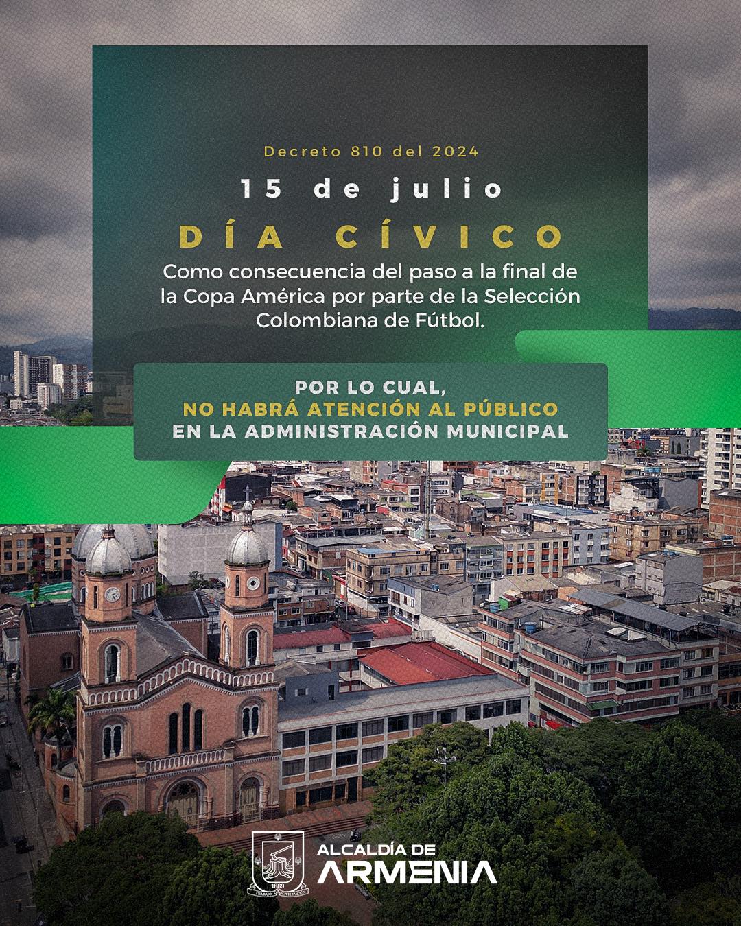 Según el decreto 810 del 2024, el alcalde de Armenia, James Padilla García, establece día cívico el lunes 15 de julio, según el pronunciamiento del Presidente de Colombia, Gustavo Petro, como consecuencia del paso a la final de la selección Colombia a la Copa América. Por tal motivo, la Administración Municipal no tendrá atención al público en ninguna de sus oficinas.