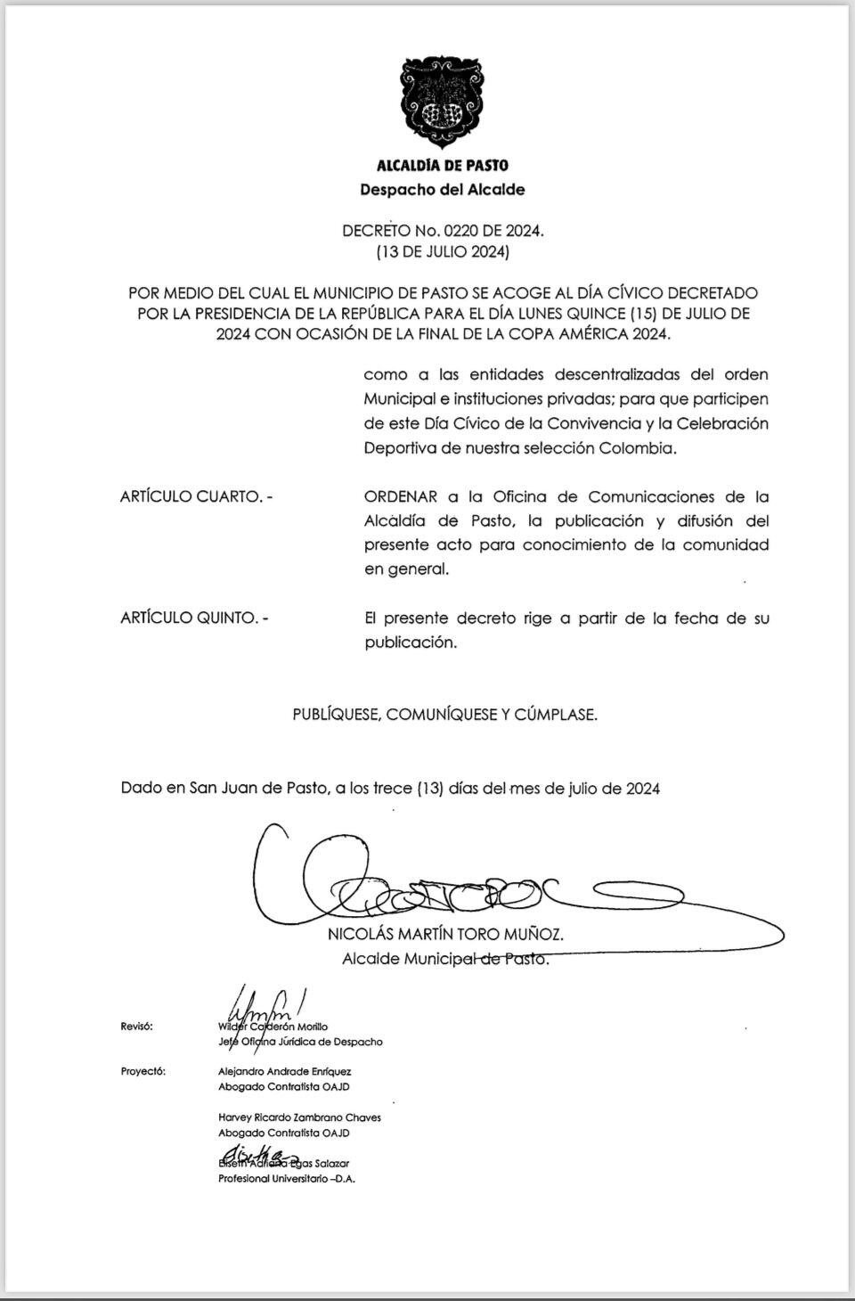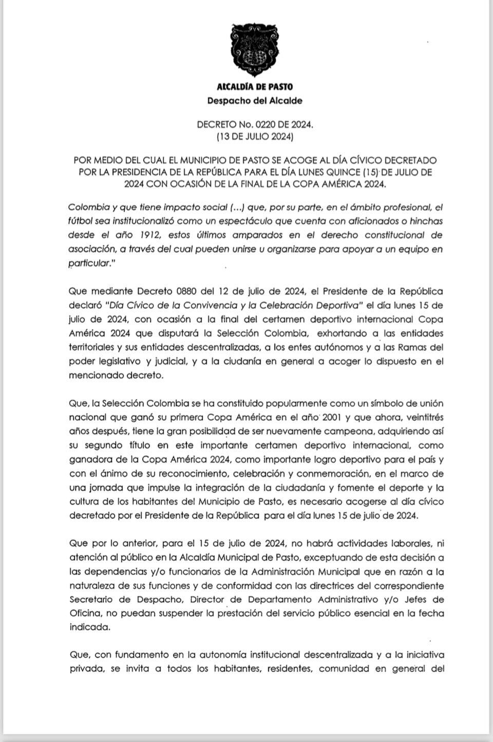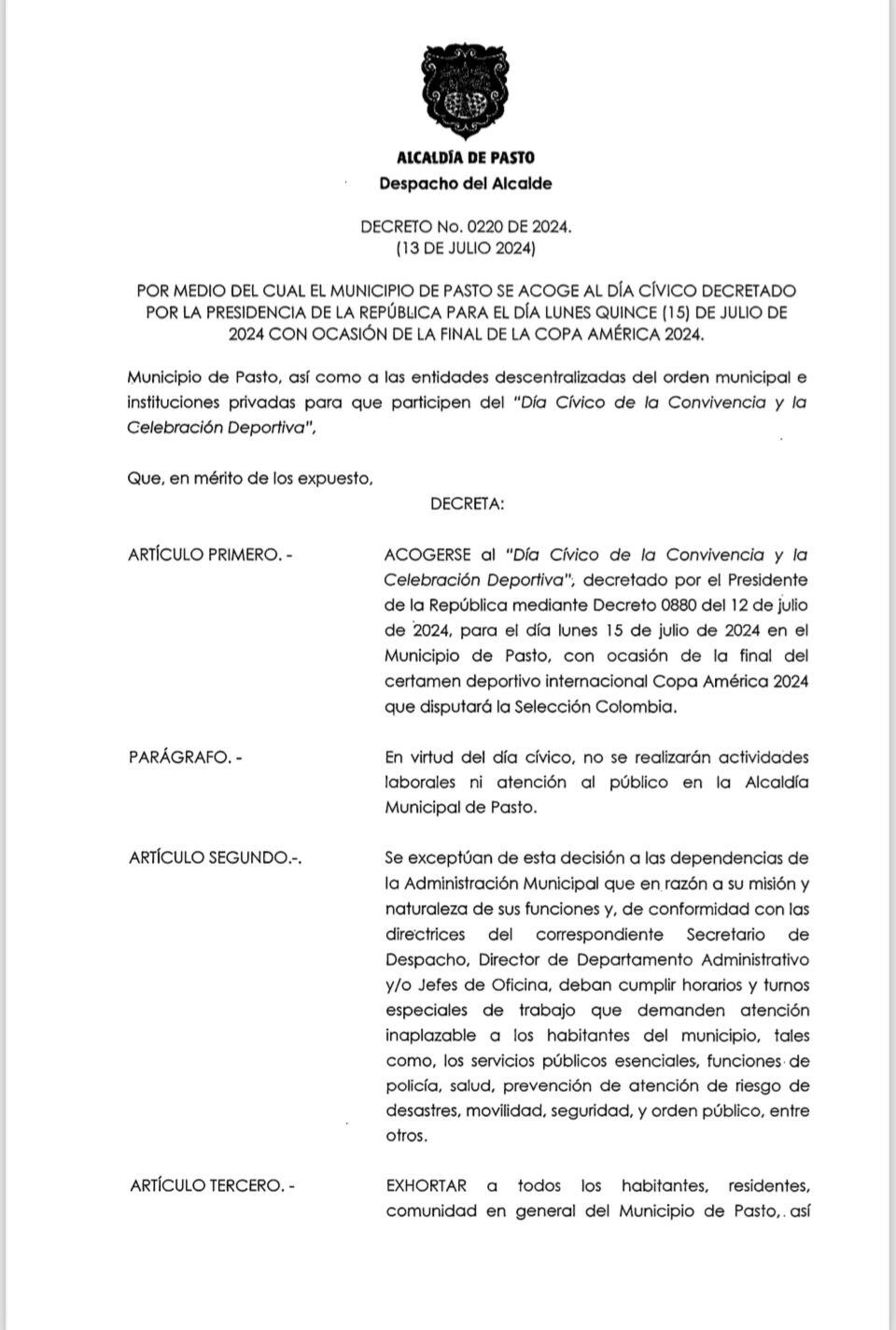 En las ultimas horas la Alcaldía de Pasto expidió el decreto a través del cual se acoge a la declaratoria presidencial de Dia Cívico por parte de la presidencia de la República.