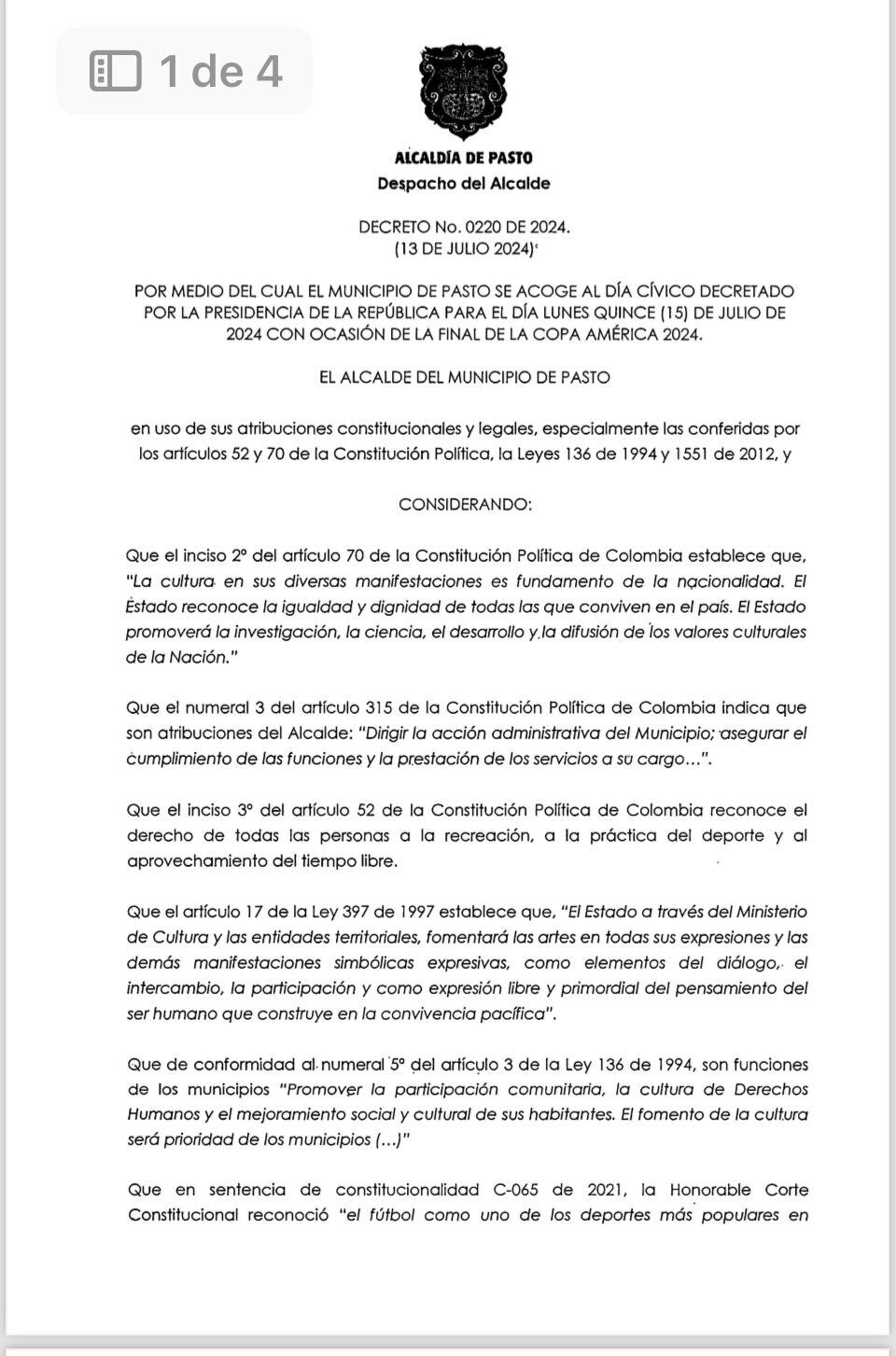 Decreto Pasto "Día Cívico"