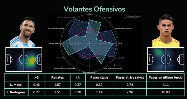 James Rodríguez comanda cuatro de los seis aspectos de análisis, el colombiano registra mejores números en las asistencias esperadas (xA), es decir la estimación estadística de la probabilidad de que un pase termine en asistencia; el de los pases claves, los pases al área del rival y los pases en el último tercio. Mientras que Messi domina las estadísticas de gol esperado y los regates.