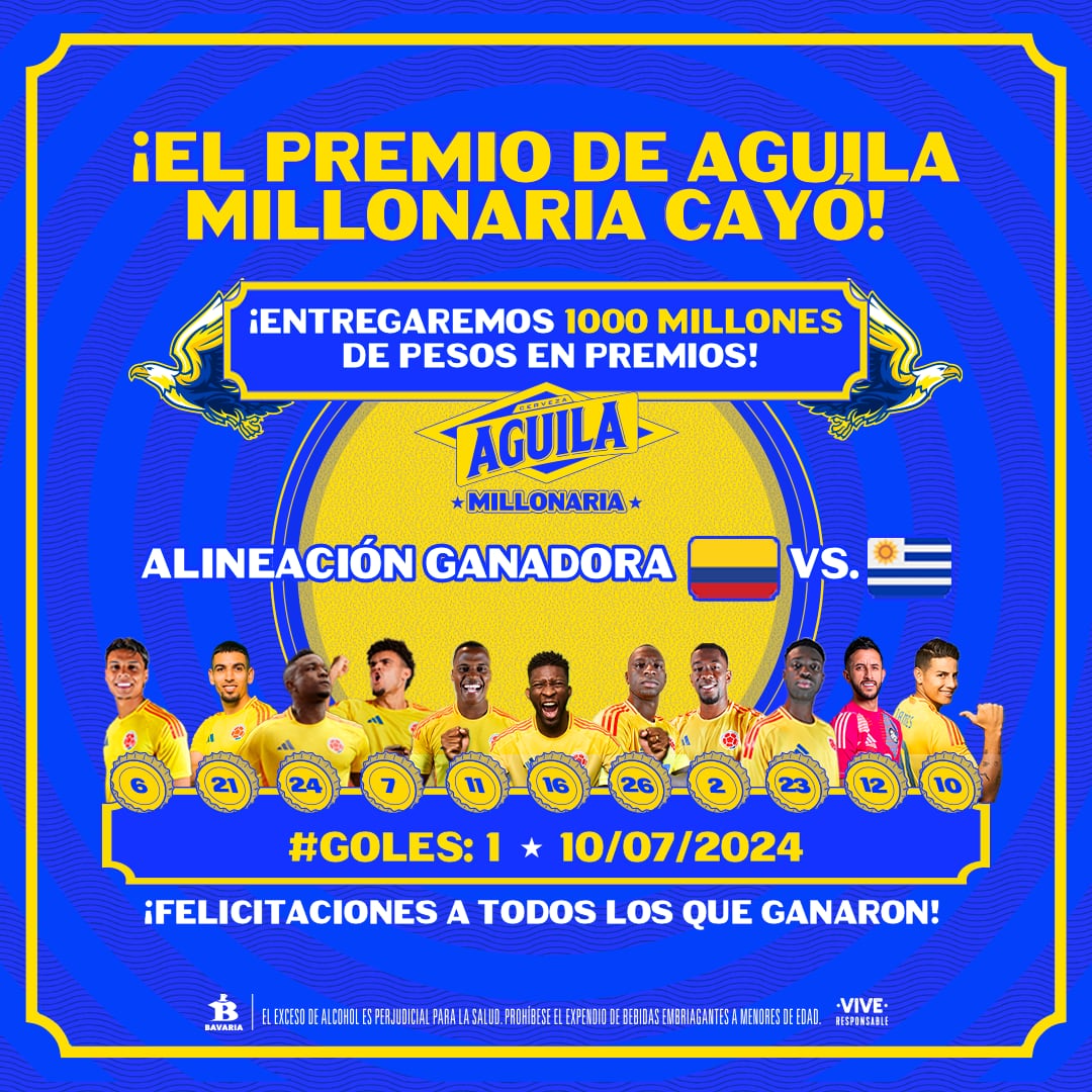 A su vez, tras este partido que puso a vibrar al país, se pronunció Álvaro de Luna, vicepresidente de mercadeo de Bavaria: “A un paso más cerca de llevarnos la Copa, estamos muy emocionados de anunciar a nuestros ganadores de la campaña Aguila Millonaria. Esta iniciativa busca unir a todos los colombianos en torno a nuestra pasión común por el fútbol y este premio es solo el comienzo de muchas más celebraciones que nos darán más motivos para brindar”, comentó.