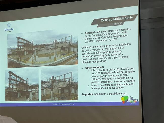 En el marco de dicha reunión se conoció el informe del ministerio del Deporte donde advirtió sobre el retraso en las obras del coliseo Multideporte por eso entre las observaciones está el de que la obra no estará terminada antes de la inauguración de los juegos nacionales que estaban destinadas para Bádminton y Parabádminton.