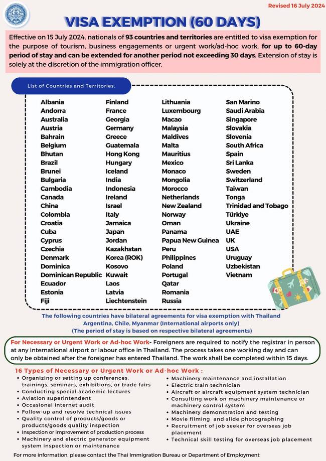 “A partir del 15 de julio de 2024, los nacionales de 93 países y territorios tienen derecho a una exención de visa con fines de turismo, compromisos comerciales o trabajo urgente/trabajo ad hoc, por un período de estadía de hasta 60 días y puede extenderse por otro período no mayor a 30 días. La extensión de la estadía queda únicamente a discreción del oficial de inmigración”, explicó en un comunicado el Ministerio del Interior tailandés.
