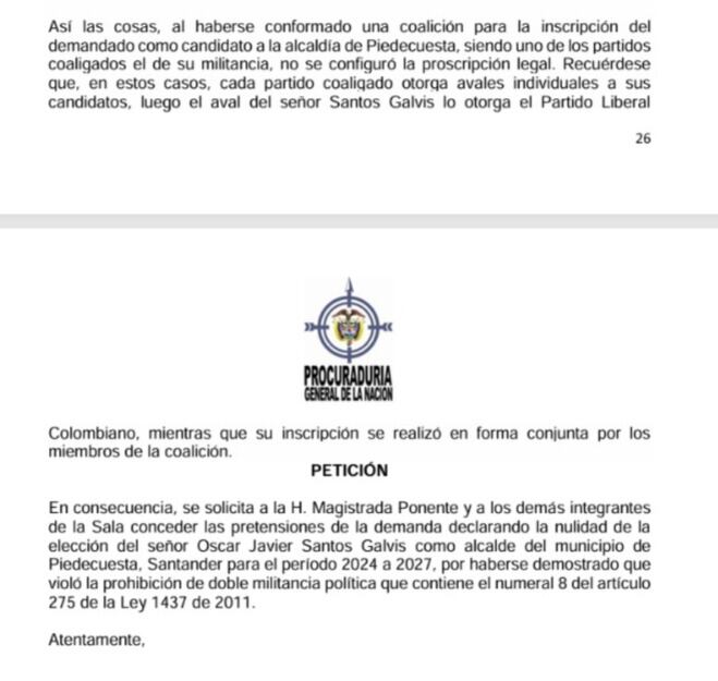 “Se le solicita a la magistrada ponente y a los demás integrantes de la sala conceder las pretensiones de la demanda declarando la nulidad de la elección del alcalde del municipio de Piedecuesta para el período 2024 a 2027, por haberse demostrado que violó la prohibición de doble militancia política que contiene el numeral 8 del artículo 275 de la Ley 1437 de 2011″, dice el documento que fue dirigido al Tribunal por la Procuraduría 47 judicial II para asuntos administrativos.
