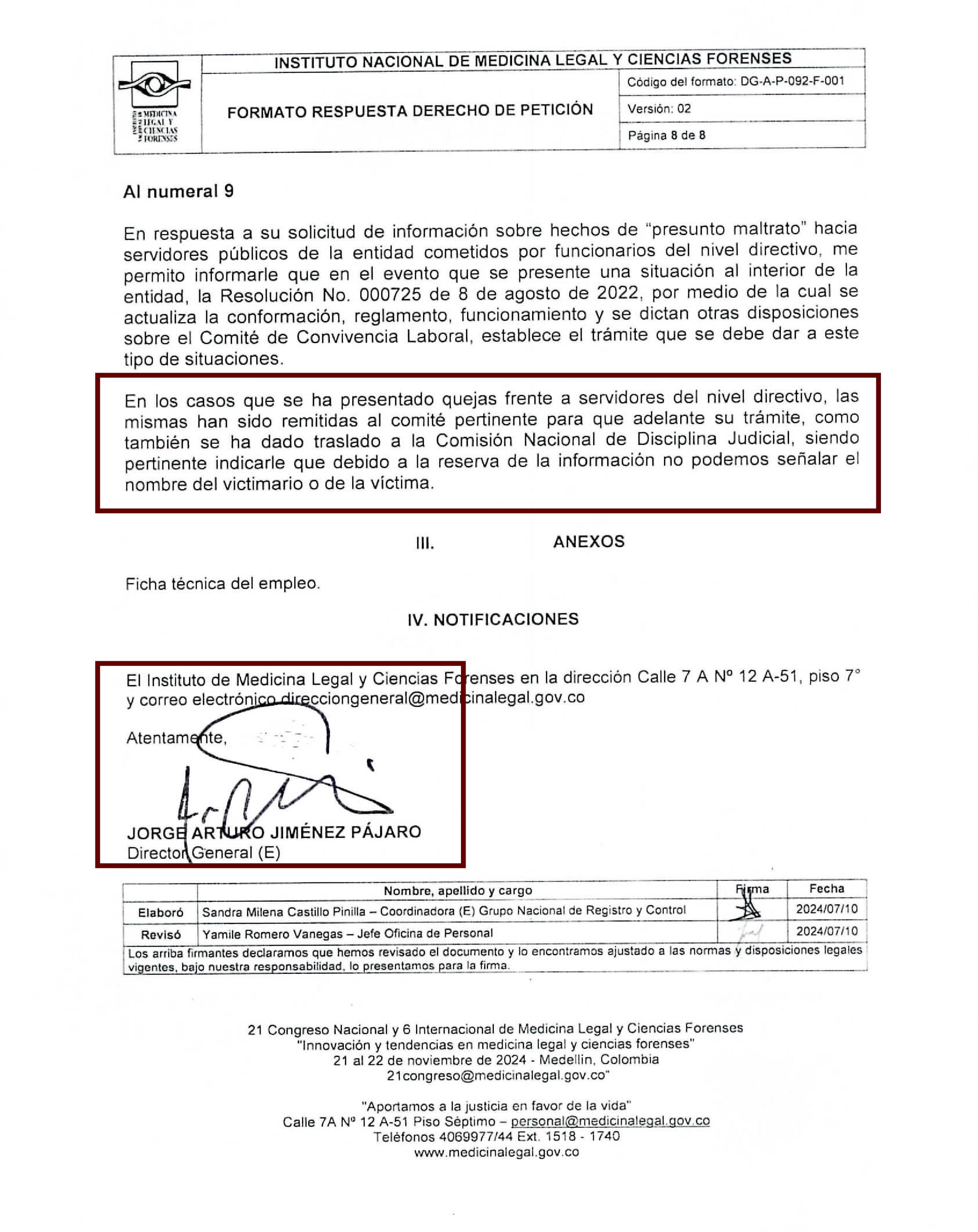 Quien firma la contestación es Jorge Arturo Jiménez Pájaro, director general (e) de Medicina Legal, y sobre ese asunto respondió lo siguiente: