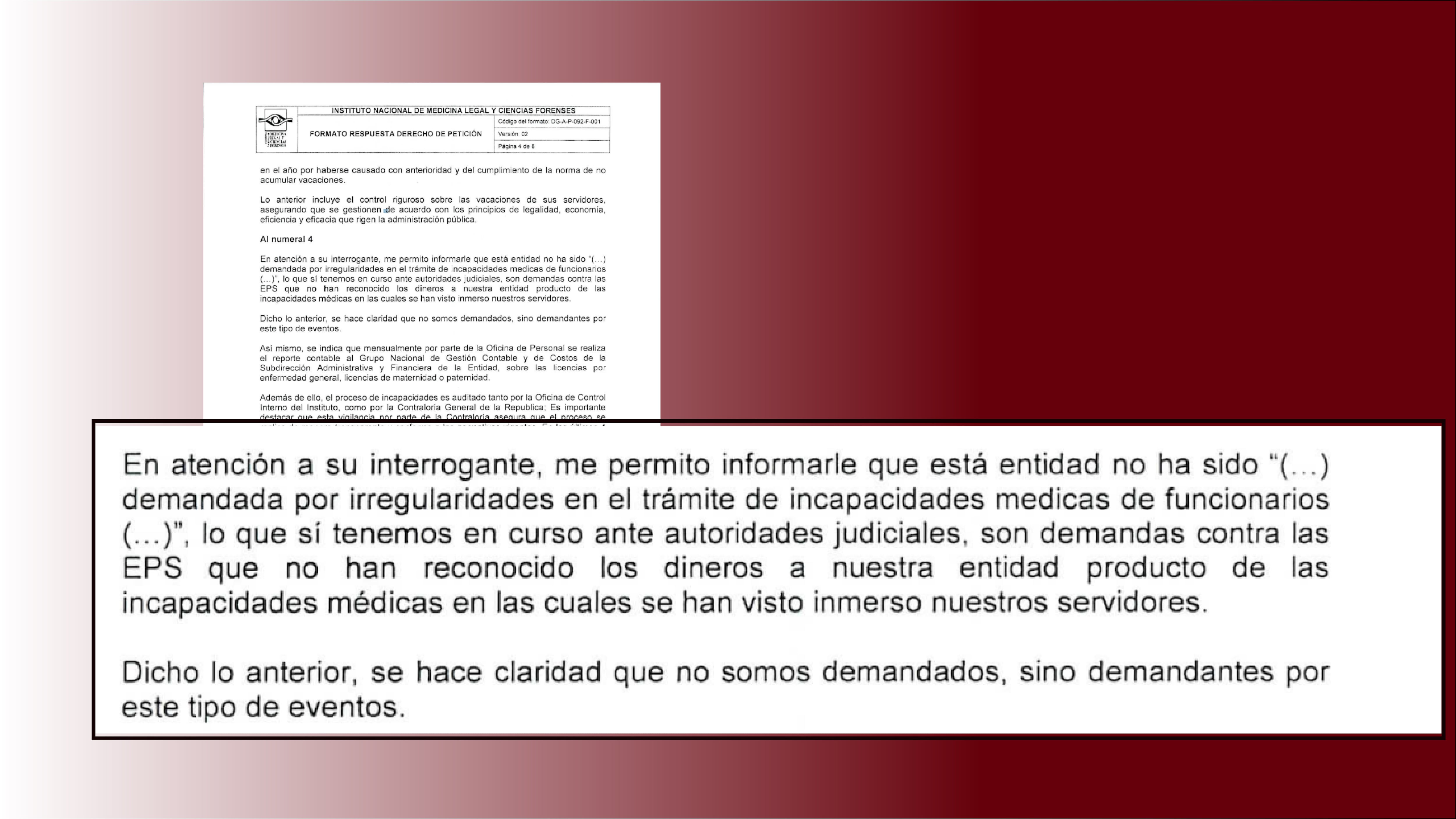 “En atención a su interrogante, me permito informar que esta entidad no ha sido demandada por irregularidades en el trámite de incapacidades médicas de funcionarios (…)”, lo que sí tenemos en curso ante las autoridades judiciales, son demandas contra las EPS que no han reconocido los dineros a nuestra entidad producto de incapacidades médicas (…) dicho lo anterior se hace claridad que no somos demandados, sino demandantes por este tipo de eventos”.