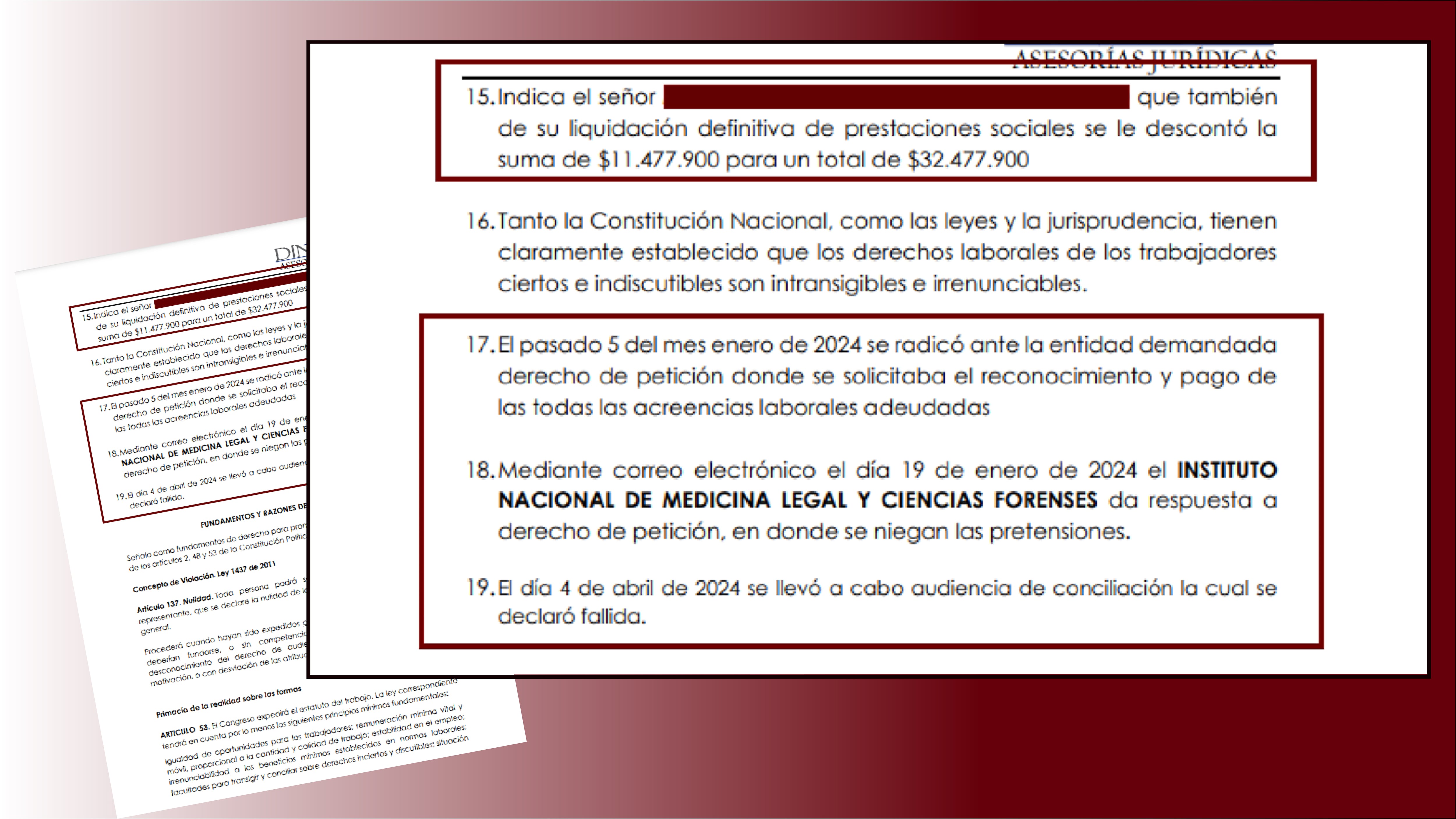 Él interpuso una demanda de restablecimiento de derechos porque se enfermó, y tuvo que ser operado dos veces por un tumor cerebral, Medicina Legal pagó el tiempo por el cual estuvo incapacitado, pero, durante sus últimos nueve meses laborales y al momento de su liquidación, Medicina Legal le descontó más de $32 millones, bajo el argumento de que, la EPS no reconoció el pago de las incapacidades y el extrabajador tenía que devolverle el dinero a Medicina Legal.