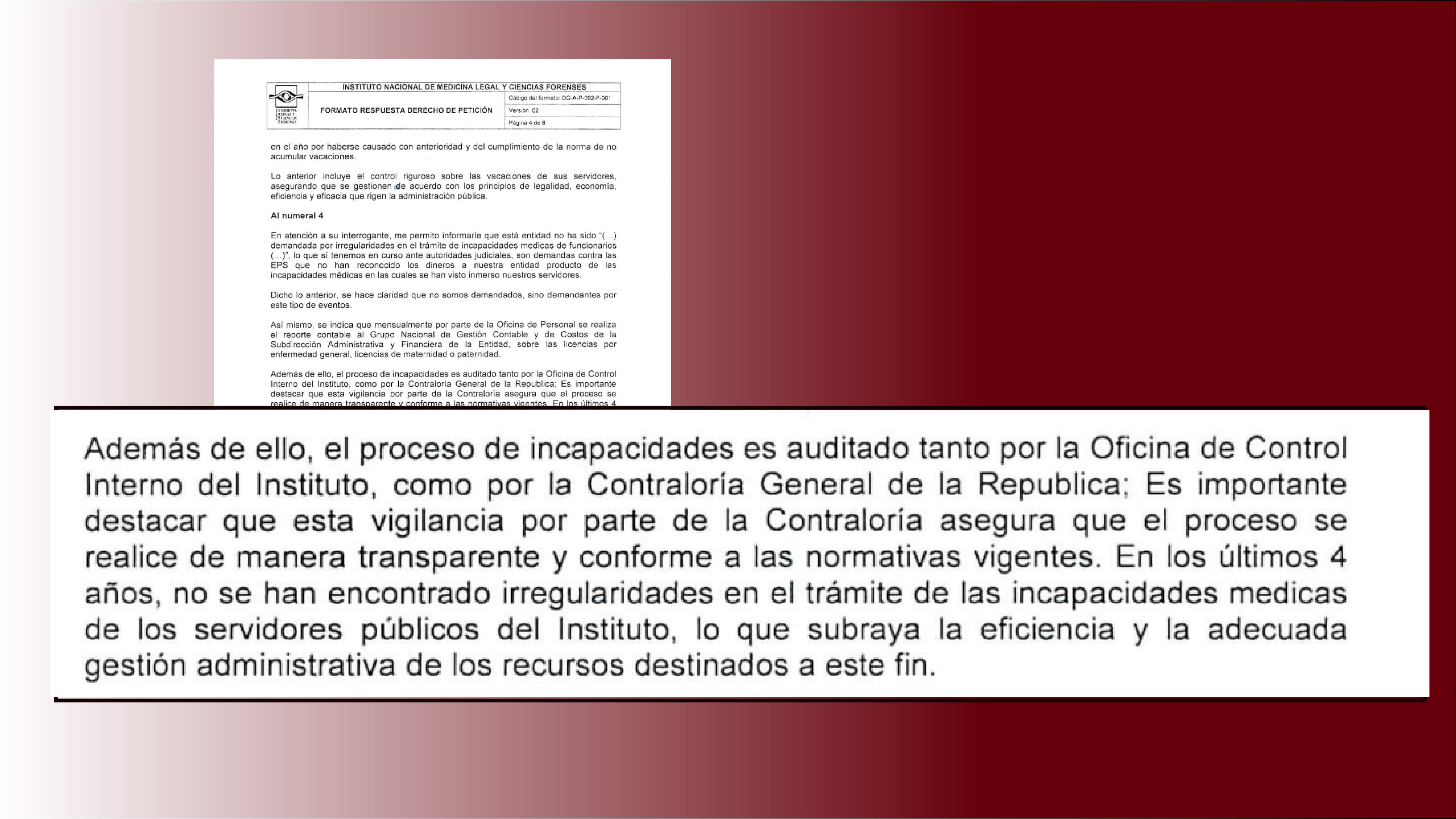 El director de Medicina Legal afirma que en las auditorias de la Oficina de Control Interno y la Contraloría General durante los últimos cuatro años no se ha encontrado irregularidad alguna en el trámite de incapacidades médicas de los trabajadores del Instituto.