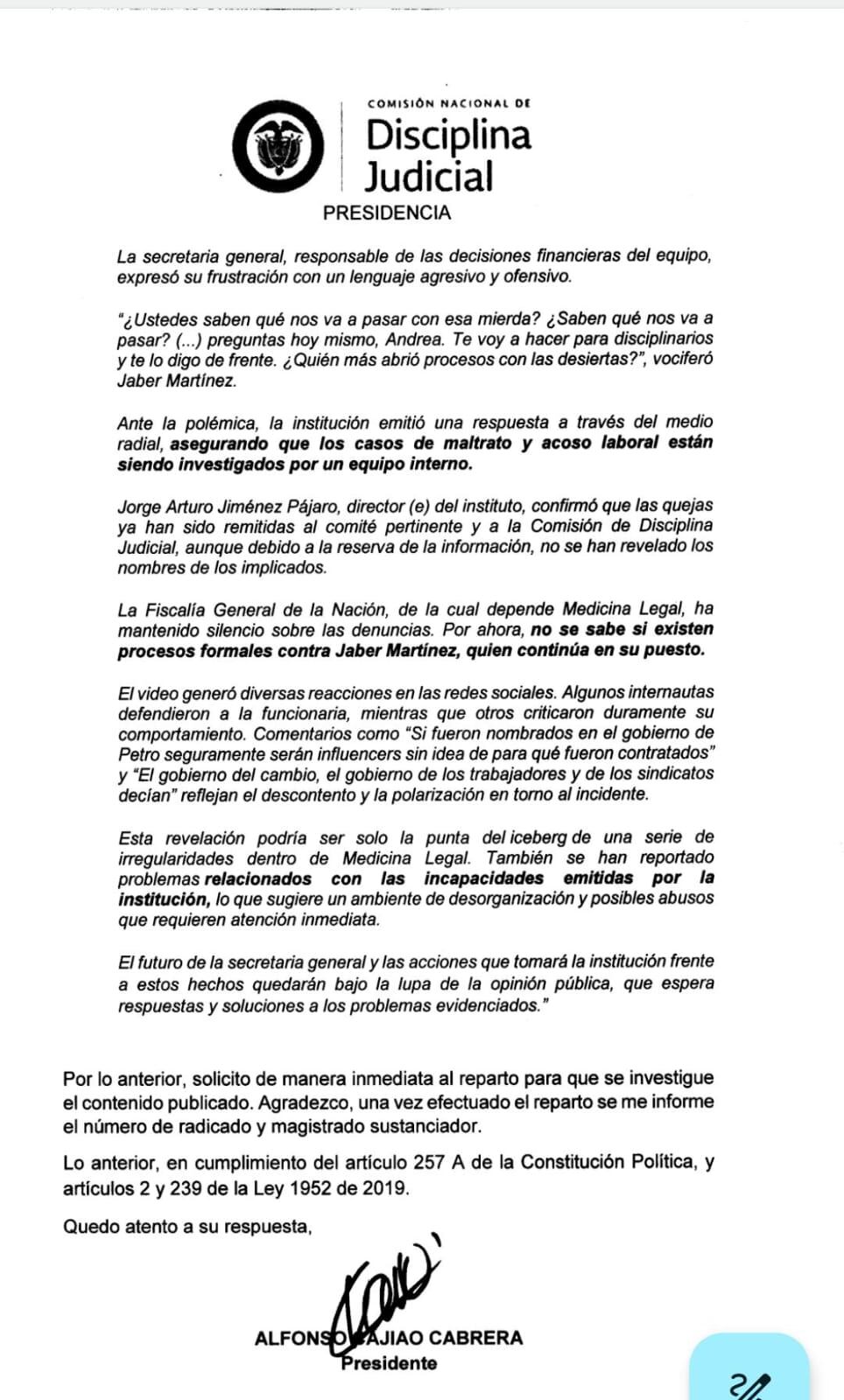 En un oficio de dos páginas el presidente de la Comisión Nacional de Disciplina Judicial, magistrado Alfonso Cajiao, ordenó a la Seccional de Disciplina de Bogotá abrir de inmediato un proceso.